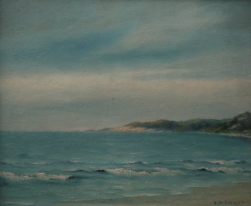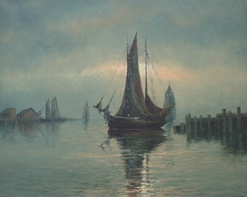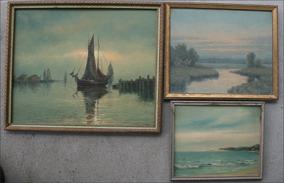 IMMER, F.H., (American, 20th C.): 3 Maritime Oils on Board; Nocturnal Harbor Scene, 16'' x 20'', signed, carved and gilded frame, 17 1/2'' x 21 1/2''; ''Pentwater'', march stream, 12'' x 14 1/2'', signed and titled, gilded frame, 18'' x 15 3/4''; Coastal Harbor Scene, 9 3/4'' x 12'', painted frame, 10 1/2'' x 12 1/2''.