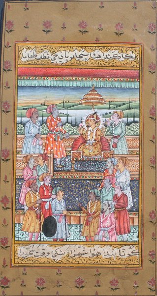 EARLY PERSIAN GOUACHE OF A ROYAL COURT: 7 1/2'' x 4 1/4'', inscription lower margin & verso, protected in a later frame, 10'' x 8''