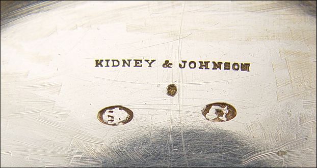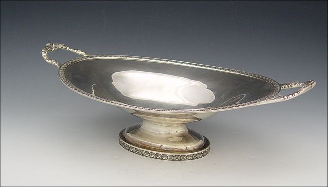 KIDNEY & JOHNSON SILVER PEDESTAL BOWL: Mid 19th century, embossed design with applied handles. Monogrammed. 4 3/4'' h. x 15'' x 8 3/4''. Approx. 21.4 troy oz.