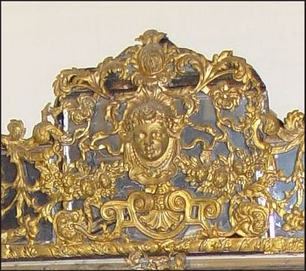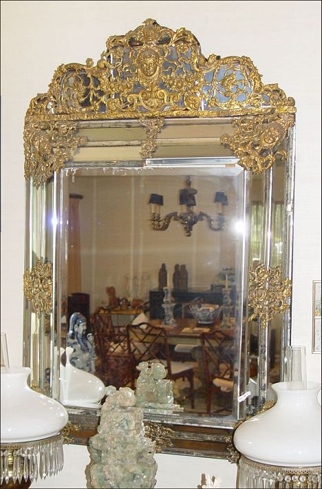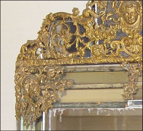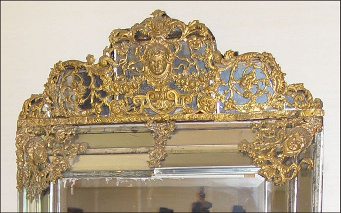 VICTORIAN VENETIAN STEP DOWN MIRROR: With detailed pressed brass mountings. Beveled glass center mirror with stepped mirror framing. Ornate openwork brass with cherubs at the corners and the top arch. 65'' tall x 34'' wide. Please call for condition.