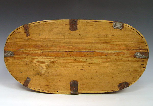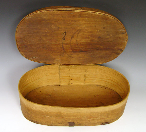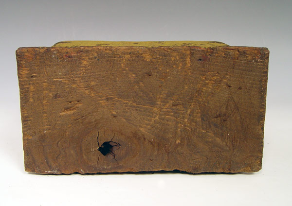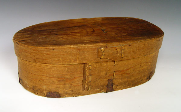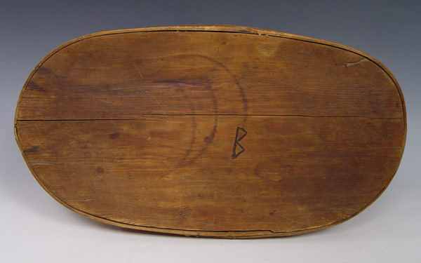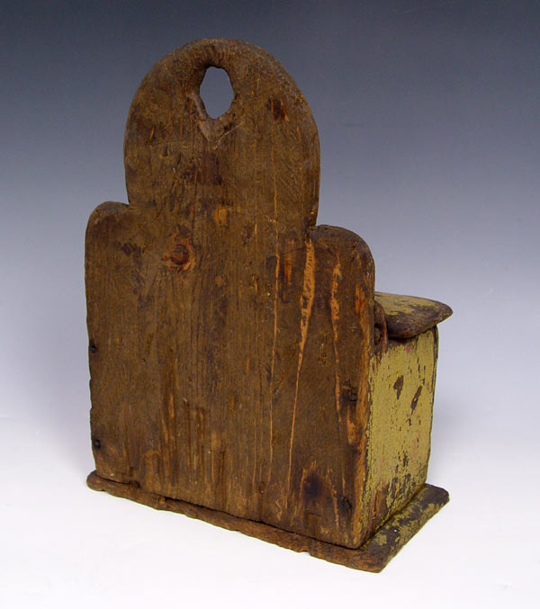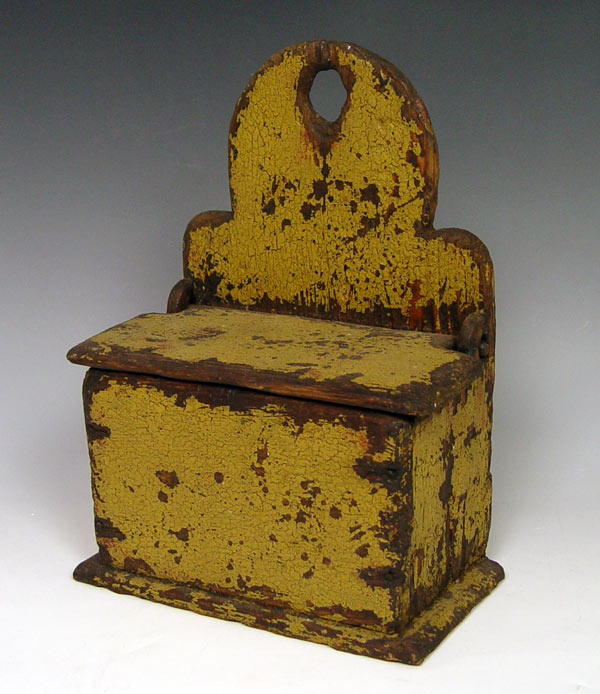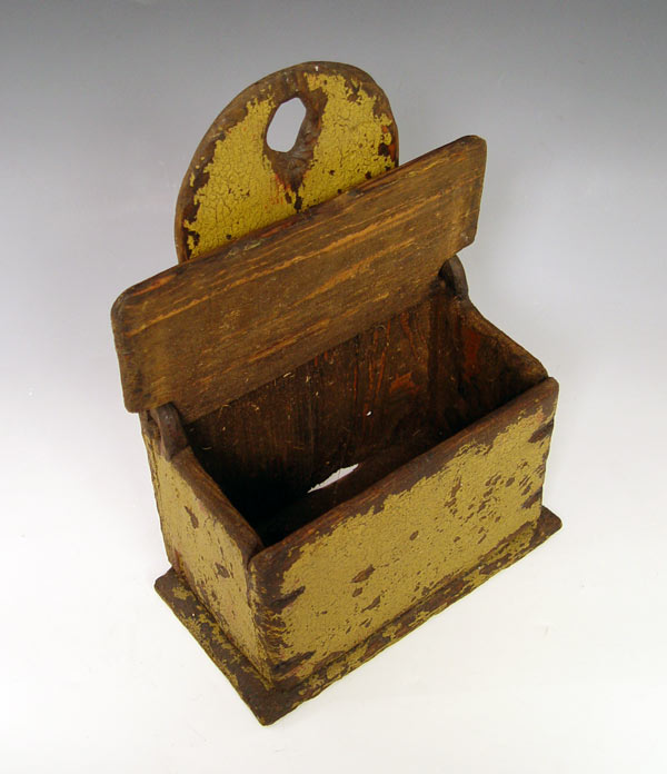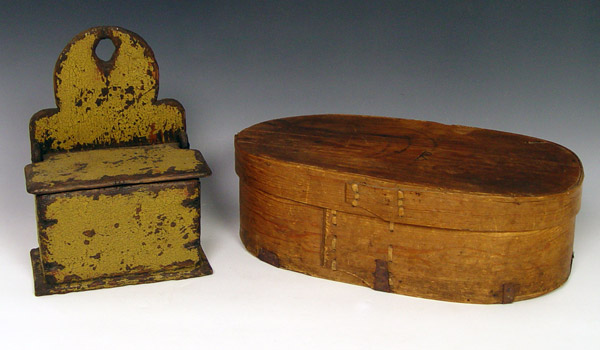 EARLY SALT BOX AND A BAND BOX: The salt box has remnants original mustard paint. Measures 13 3/4'' 10'' x 5 1/4''. Band box with carved monogrammed B on top, 7'' h. x 20 1/2'' x 11''