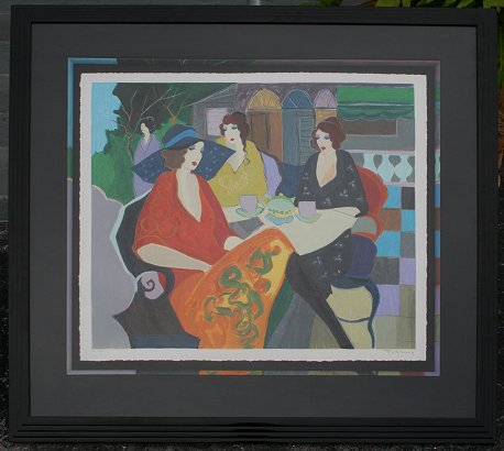 TARKAY, Itzak, (Israel, 1935-): Ladies at an Outdoor Cafe, Color Lithograph, 29 1/2'' x 35 1/2'', pencil signed lower right, numbered lower left A.P (Artist's Proof), 30/35, encased in sensational black lacquer frame with liner designed specifically to match this print, 44'' x 50 1/2''.