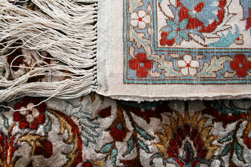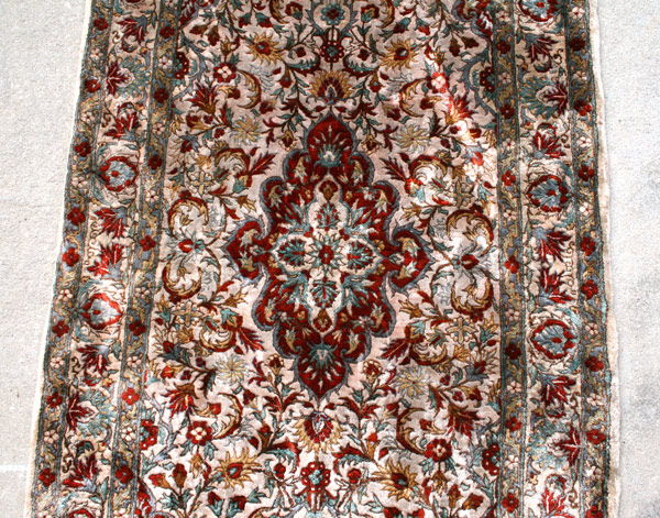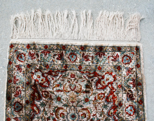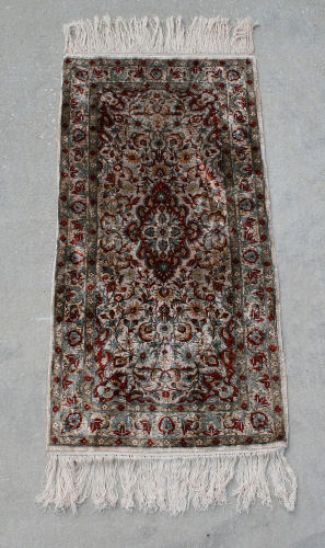 SILK PERSIAN DESIGN RUG: 900 kps, approx 2' 1'' x 4' plus 6 inches of rich fringe.