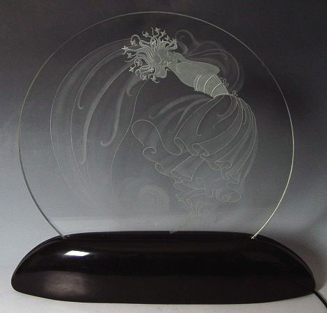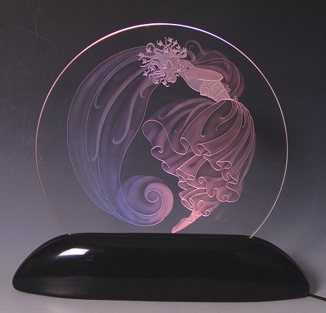 ERTE LUMINAIRE: Glass insert with etched design of young maiden, lights up to color, 18 1/2'' x 20'', etched Erte' signature in glass, numbered 71/99.