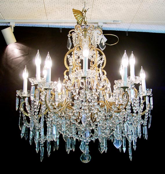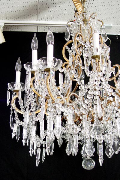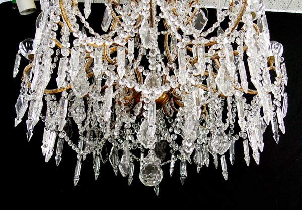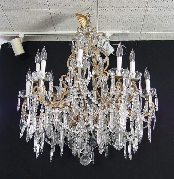 12 LIGHT CRYSTAL CHANDELIER: Bronzed metal frame with bead trim, swags of prisms and faceted center drop, approx. 33'' dia., 35''h.