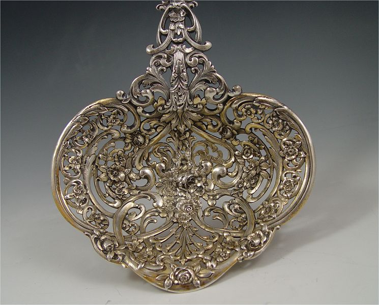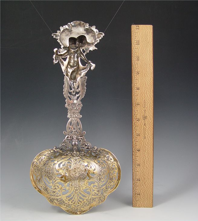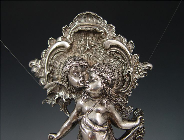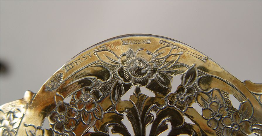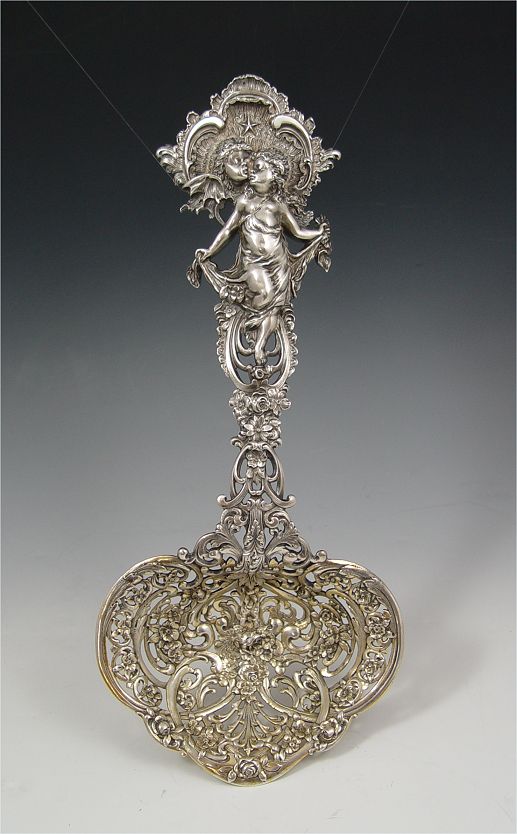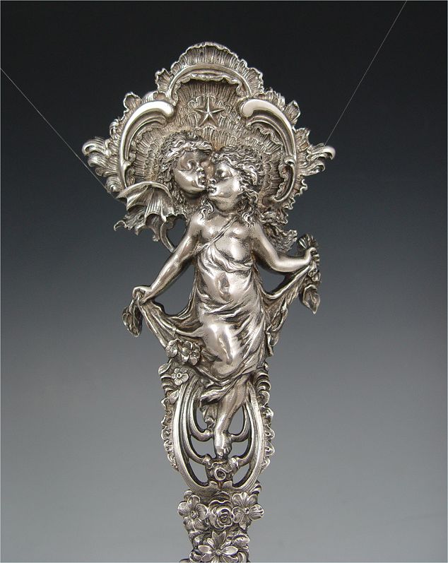 MONUMENTAL TIFFANY & CO. OPEN WORK BON BON SERVER: Manufactured for the Paris Exposition of 1900. Allegorical motif of embracing putti, one with wings, the other full body, framed by an ornate cartouche centered by a star. Elaborately pierced bowl, stem and terminal. Previously displayed at the Museum of Early Trades & Crafts in Madison NJ. A companion piece representing Morning is seen in Tiffany Silver Flatware When Dining was an Art by William Hood Jr. with Roslyn Berlin and Edward Wawrynek, pg. 282. Stamped mark ''Tiffany & Co. Makers Sterling Silver'' as well as the stamp for the Paris Exposition. 15.53 troy oz. 13.5'' length.