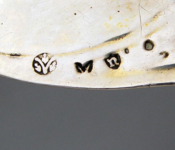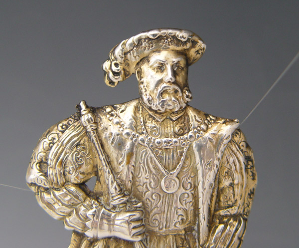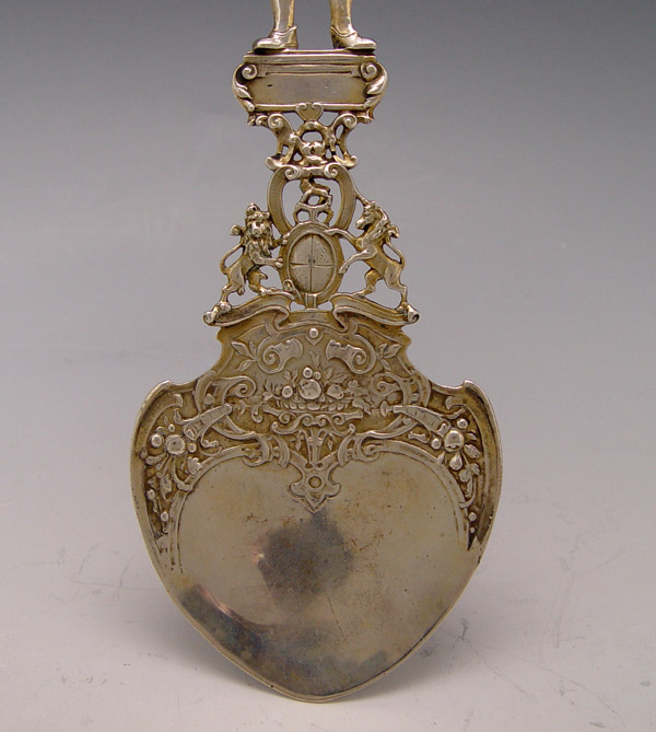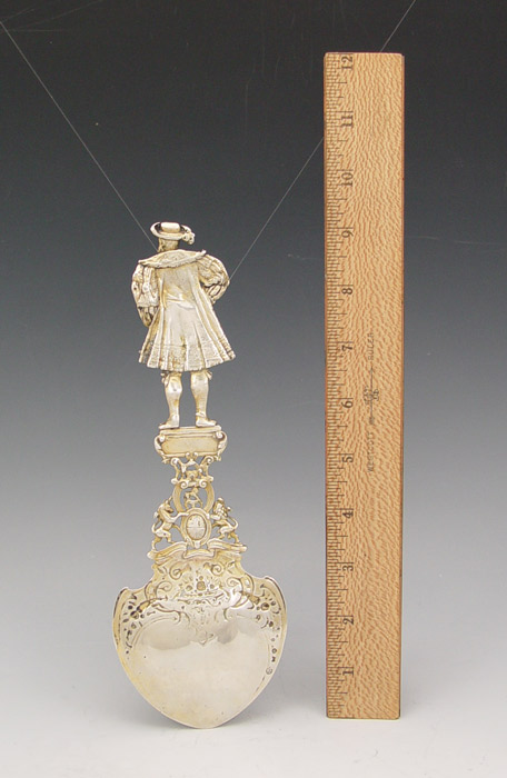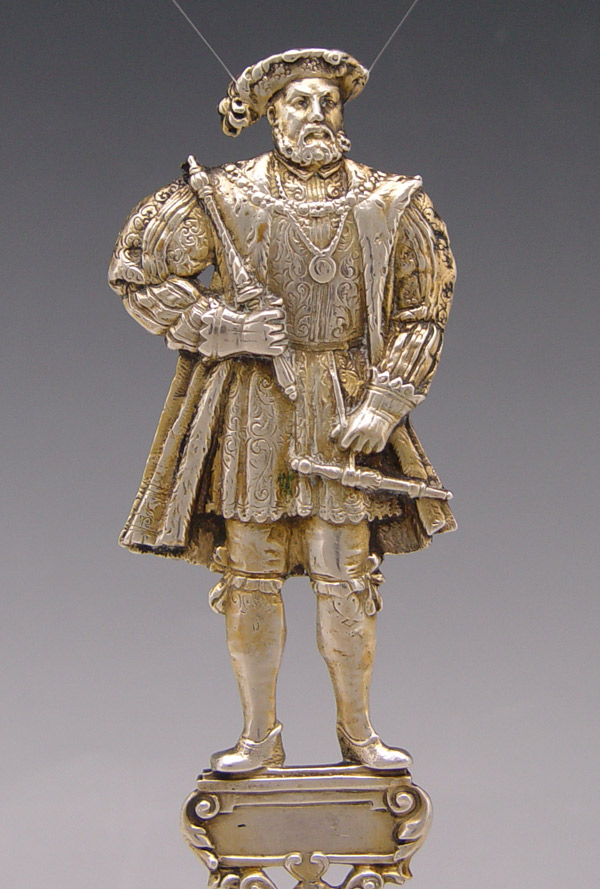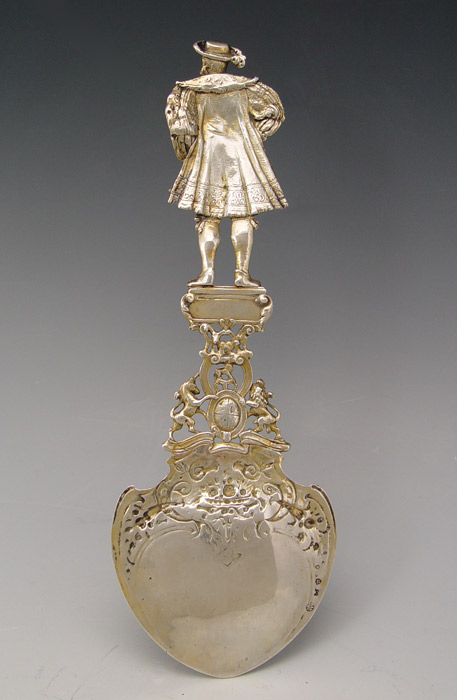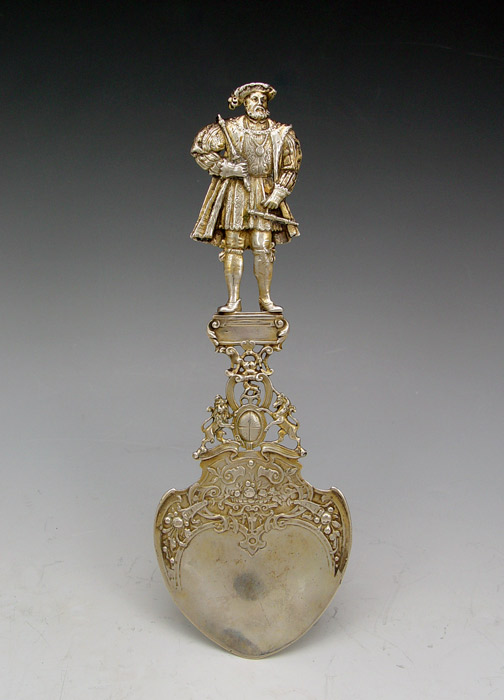 NERESHEIMER & SOHNE CONTINENTAL SILVER HENRY VIII SPOON: Hallmarked with Hanau maker B. Neresheimer & Sohne mark. Figural Henry VIII with United Kingdom coat of arms. Circa 1890's-1910. Actual silver content unknown. 9 1/4'' long. Approx. 3.7 troy oz.