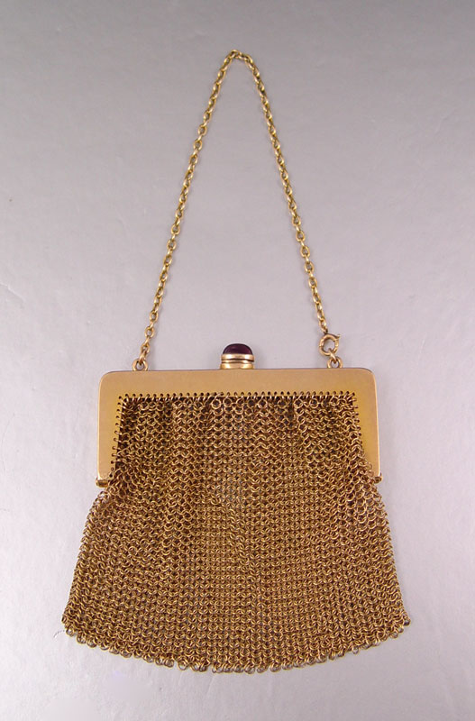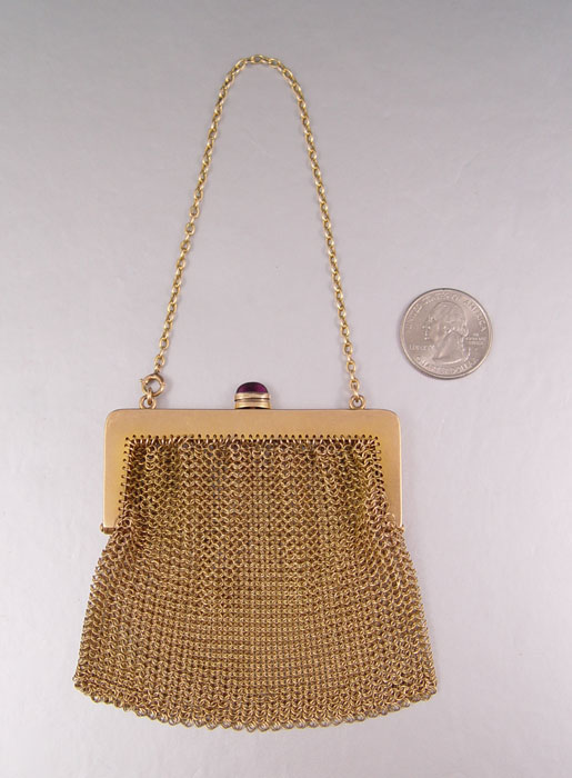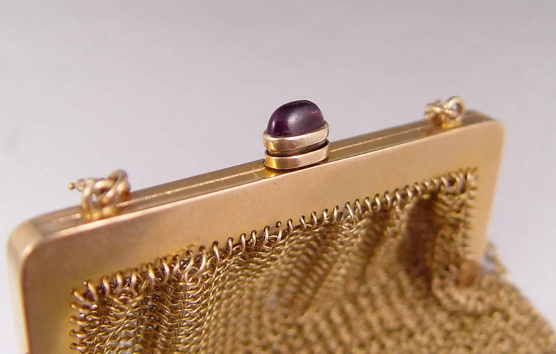 14K GOLD CHAIN MAIL PURSE: 14K yellow gold chain mail purse. The purse measures approx. 3'' x 3'' Oval cabochon cut amethyst in the clasp. Inscribed: M. Blackwell inside of frame. Weight: 64.2 grams.