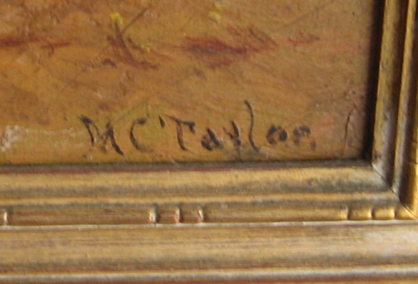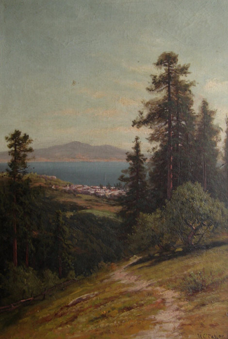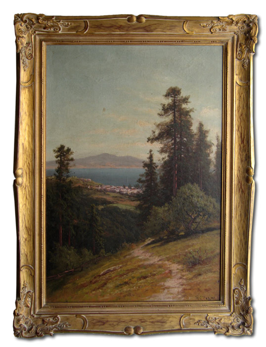 VIEW OF VILLAGE FROM THE PINE CLIFF: OIL/Canvas/Board, 24 1/2'' x 16 1/2'', signed M.C. Taylor, fine carved and gilded period frame, 29'' x 21 1/4''.