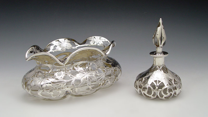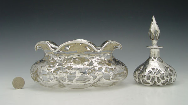 2 PIECE SILVER OVERLAY CENTERBOWL & PERFUME: To include 1) Centerbowl, unsigned as to maker, glass marked J 23. 3 3/4'' h. x 8'' x 5''. 2) Perfume with stopper, unsigned as to maker, glass marked 402. 5 1/2'' h. x 3 1/2''.