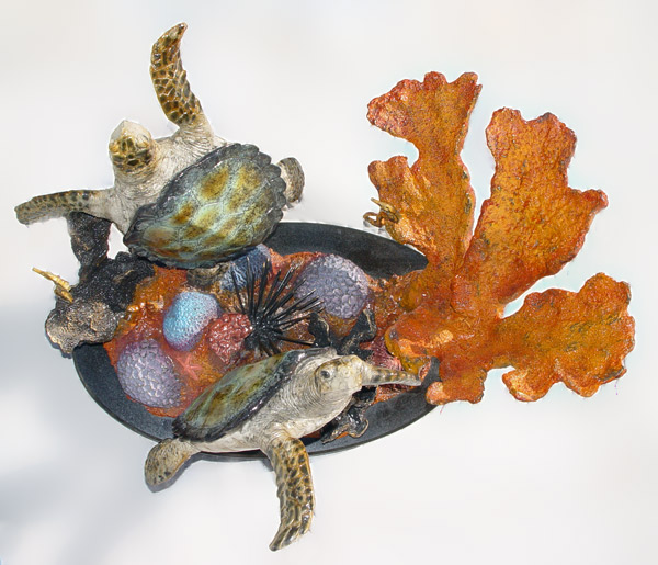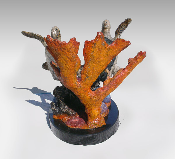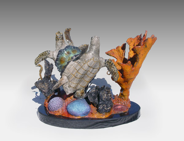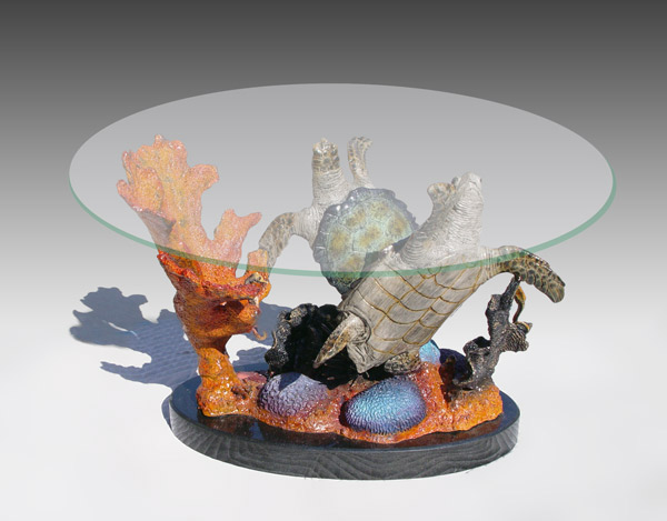 TOWNSEND, John, (American, 20th C.): ''On the Reef'', Patinated Bronze, 19 1/2'' h., 25'' w., 19'' d., signed and numbered 261/299, American Bronze Fine Art Foundry COA, approx. weight 125 lbs., affixed to marble plinth, sold with glass top for use as table.