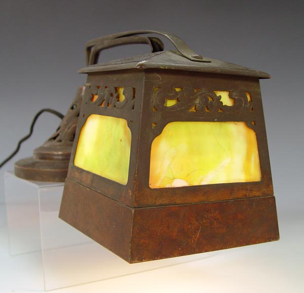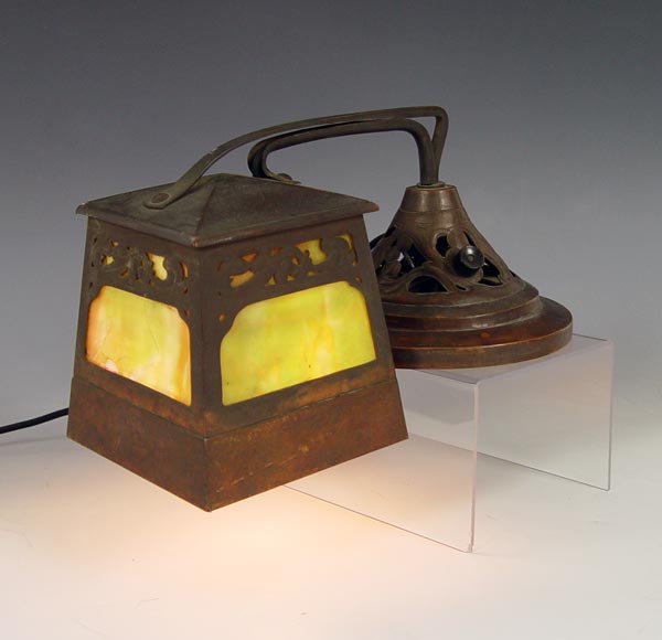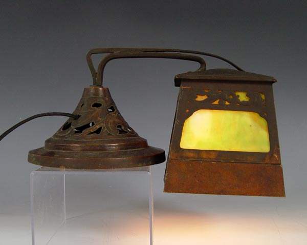 ARTS & CRAFTS PIANO LAMP: Bronzed weighted base and shade with slag glass inserts. Lamp was designed to be placed on top of piano above keys. Open work leaf and berry design. Unmarked as to maker. Measures 7'' h. x 13 1/4'' x 7''.