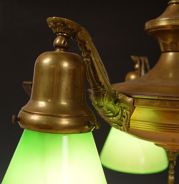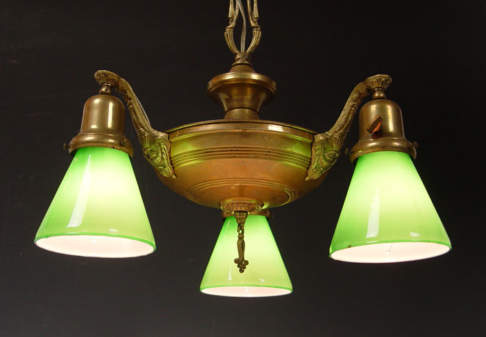 VINTAGE BRASS EMERALITE HANGING LIGHT: Three green cased shades, brass fixture. 12'' dia., hangs 24'' length includes the chain. Attribution.