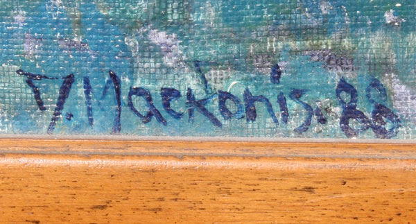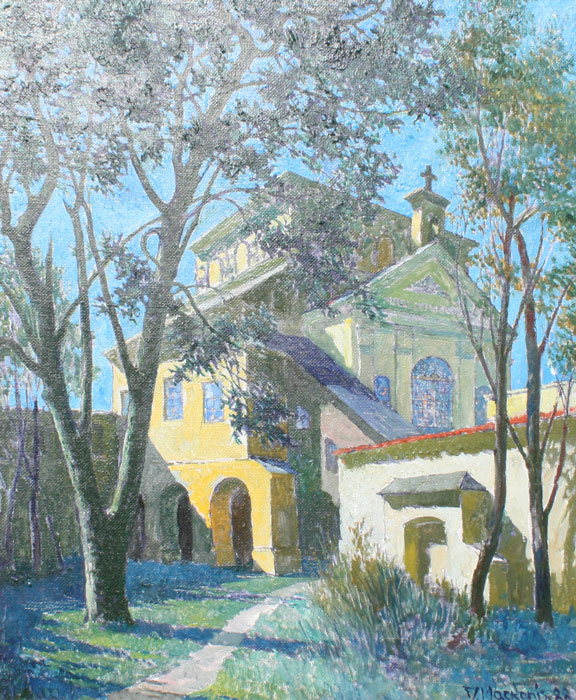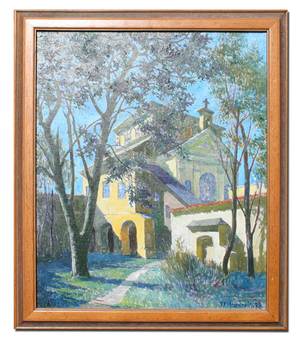 MACKONIS, Jonas, (Lithuanian, 1922-): Landscape with Church, OIL/Canvas, 23 1/2'' x 19 1/2'', signed, dated '88, framed, 27'' x 23'', artist info verso.