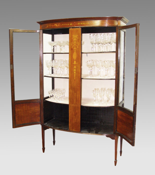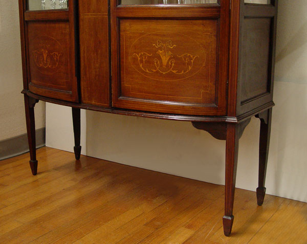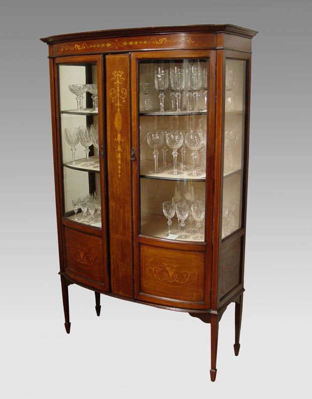 EDWARDIAN INLAY DISPLAY CABINET: Slightly bowed double doors divided by a bell flower inlay panel. Lower portion of doors with flower baskets. 3 shelf interior lined with textured paper over blind storage. 66''h. x 42'' x 15''.