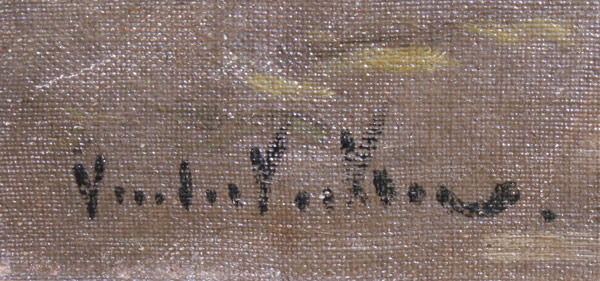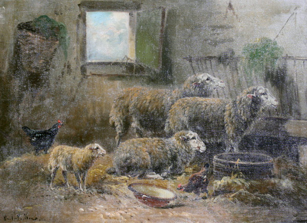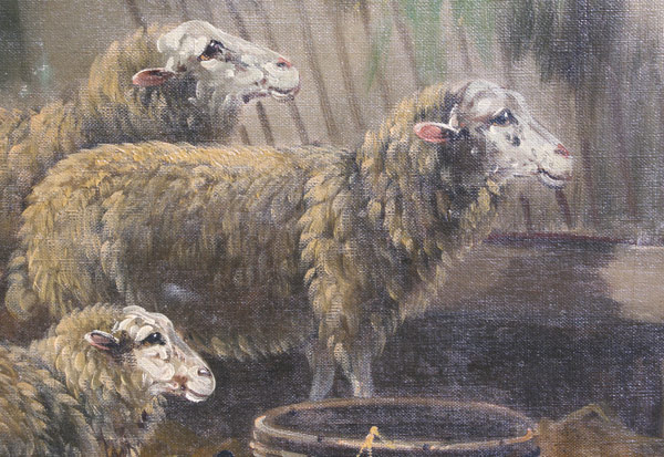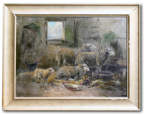 ILLEGIBLY SIGNED BARN INTERIOR WITH SHEEP & HENS: Oil/Canvas, 19'' x 26 1/2'', illegibly signed, gilded frame with wear, 25'' x 32''.