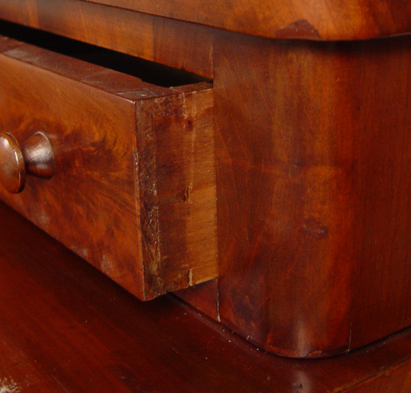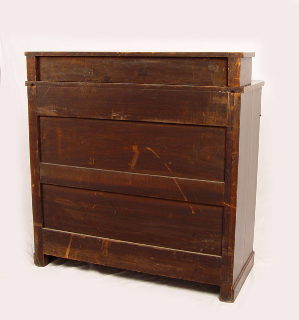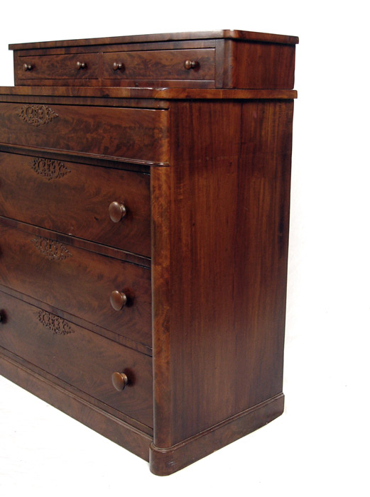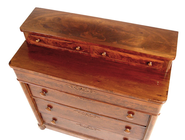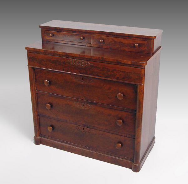 EMPIRE PERIOD 2 OVER 4 DRAWER FRAME MAHOGANY CHEST: 2 drawer stepback top over 4 drawer. Applied cut decoration around key holes. Half column front and turned wood pulls. 41'' wide, 19'' deep, 43'' tall.