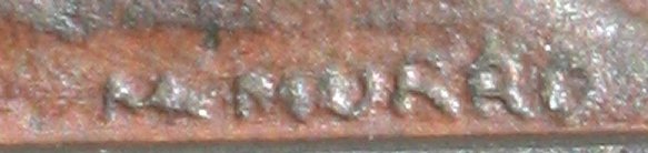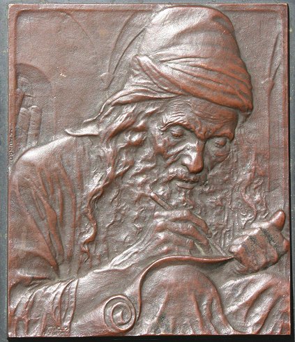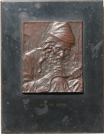 YIHIA THE SCRIBE JEWISH BRONZE: 3 7/8'' x 3 1/4'', 7 1/4'' x 5 1/2'' with bronze backplate (missing nut), incised Yiddish script, signed Murro.