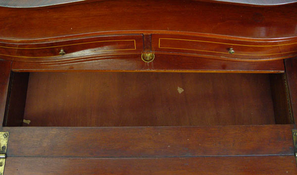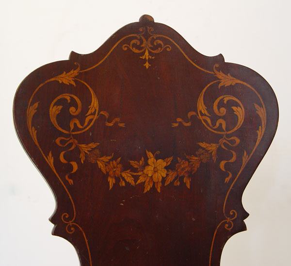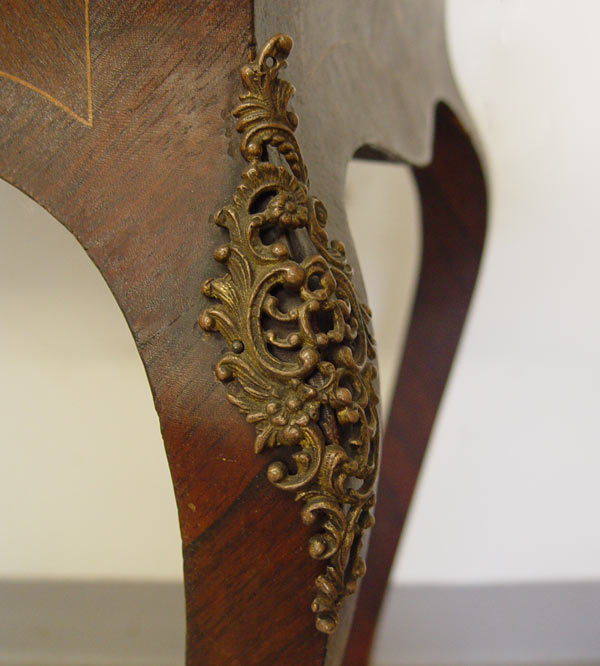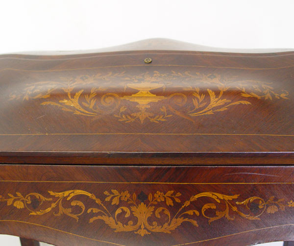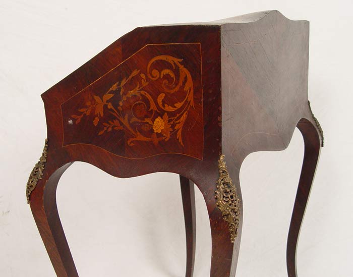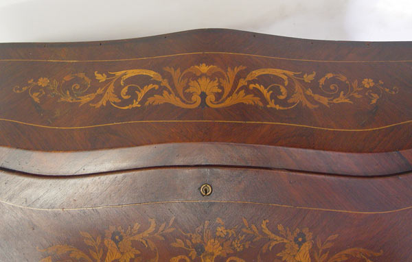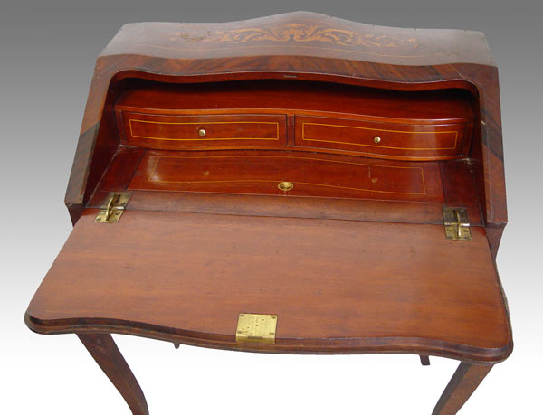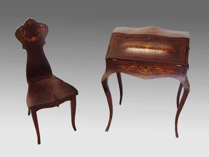 FRENCH INLAID DROP FRONT DESK WITH CHAIR: Serpentine style drop front with 2 drawer and slide drop well, interior. Urn and floral motif inlay throughout. Long French legs with ormolu 16 ½'' wide, 19'' deep, 35 ½'' tall. Note: Missing brass gallery. Late 19th -early 20th C.