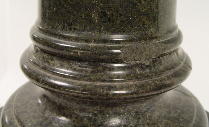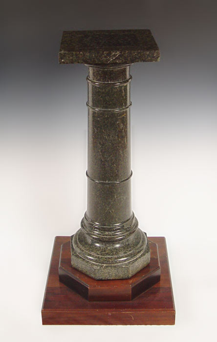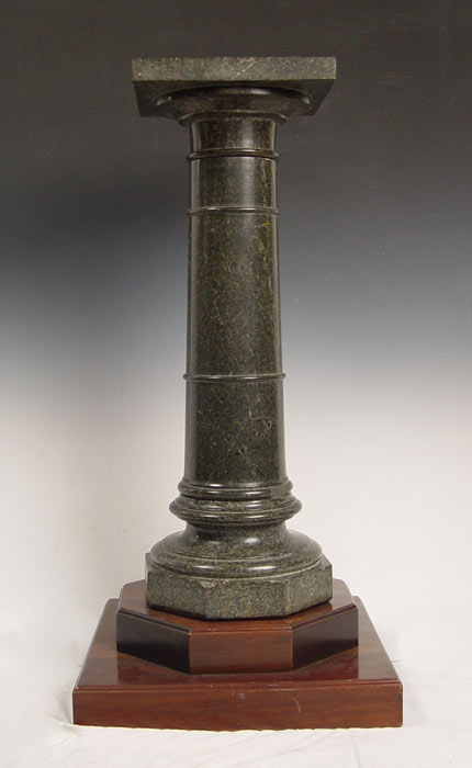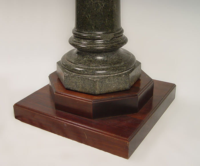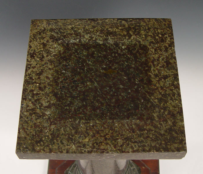 GREEN MARBLE PEDESTAL: 3 part marble with rotating square top and octagonal base. On wood base for additional height. Marble is 35'' tall x 13'' square. Wood base is 6'' x 20: square. 41 1/2'' h. x 20 1/2'' square.