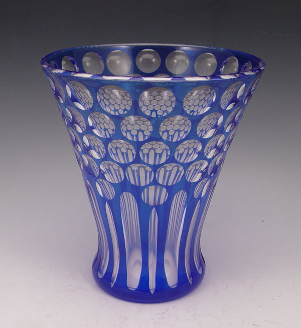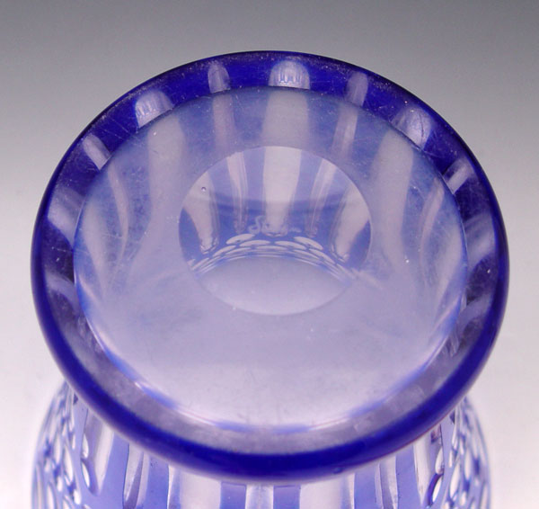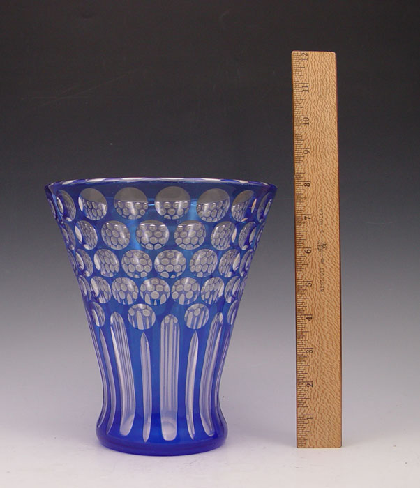SIGNED STEUBEN COBALT BLUE CUT TO CLEAR VASE: Flared form, 8'' tall, 7'' dia.