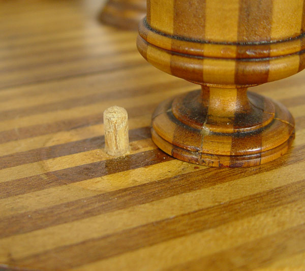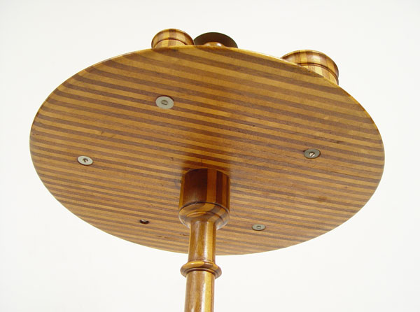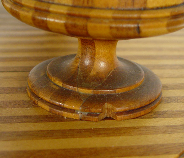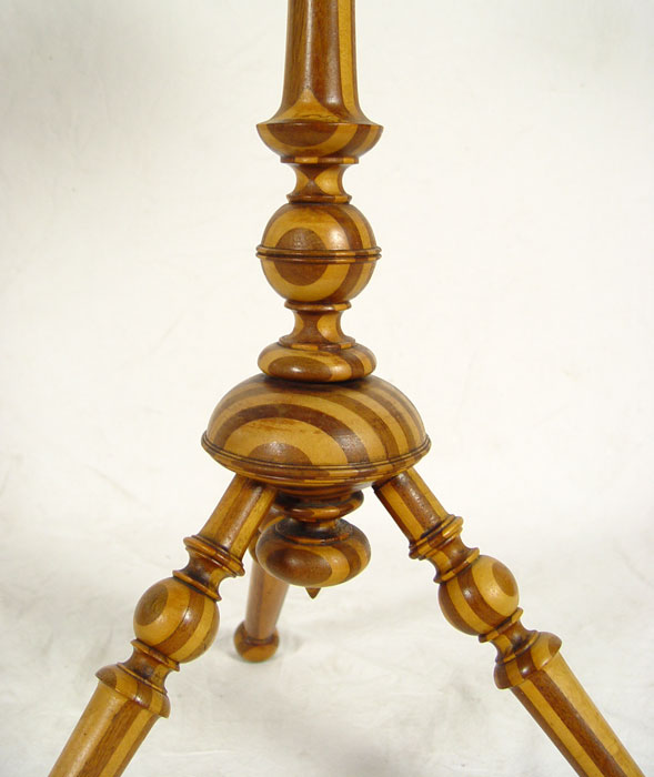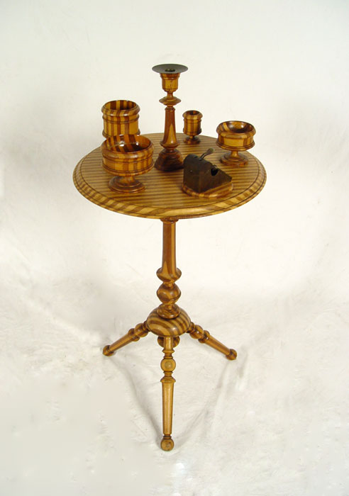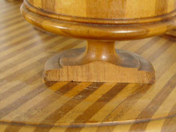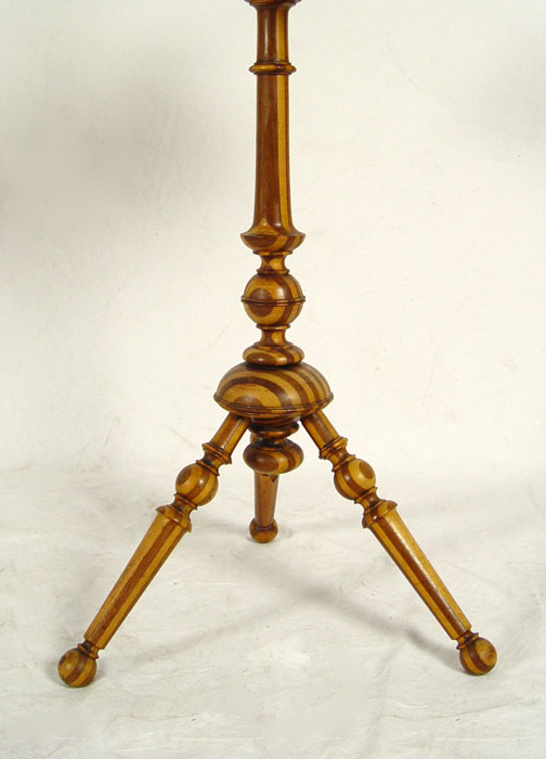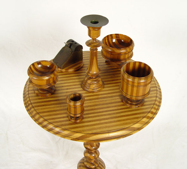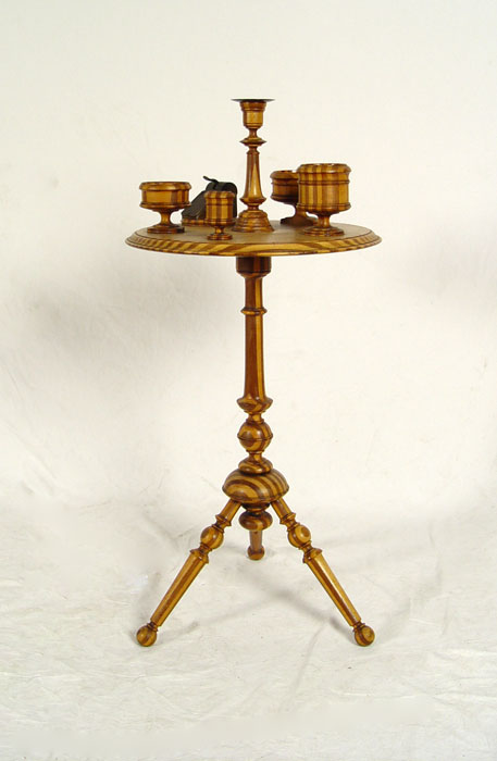 FOLK ART SMOKING STAND: One of a kind, handmade with alternating strips of light and dark wood with pattern repeating through legs, candlestick, 3 bowls and base for small cutter. Measures 37 1/2'' h. x 17 1/2'' dia. CONDITION: Note bases on 2 bowls.