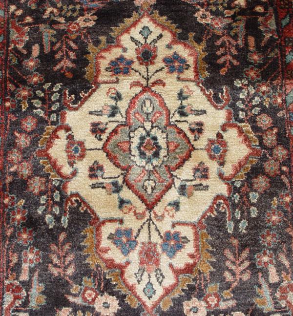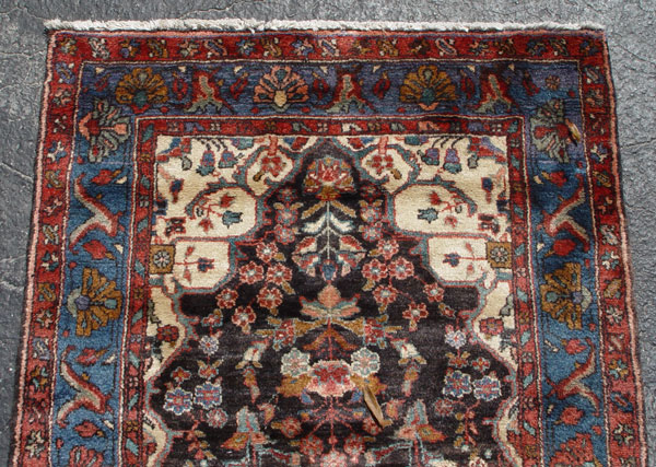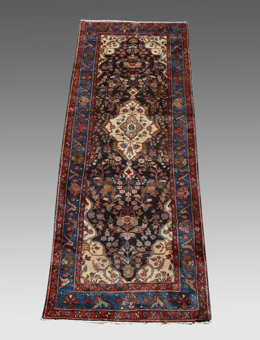 HAMADAN CARPET RUNNER: Black ground, Approx 9' 8'' x 42''.