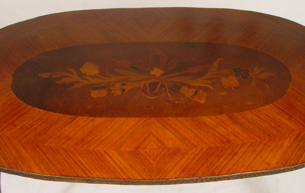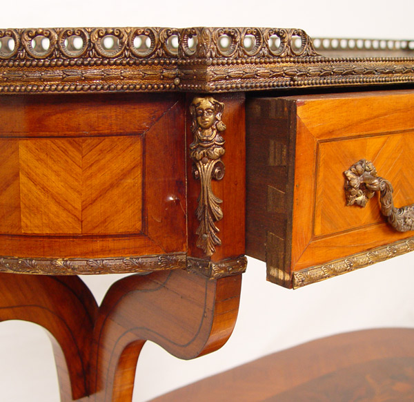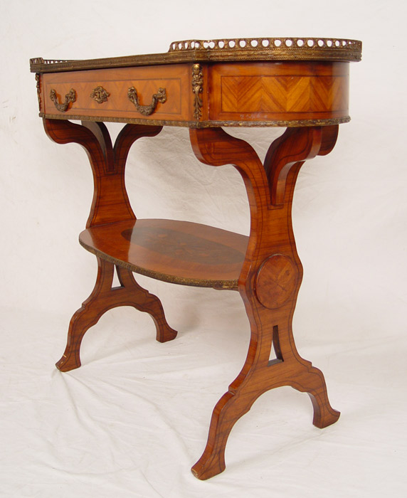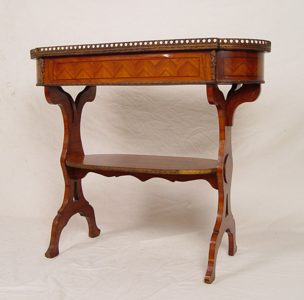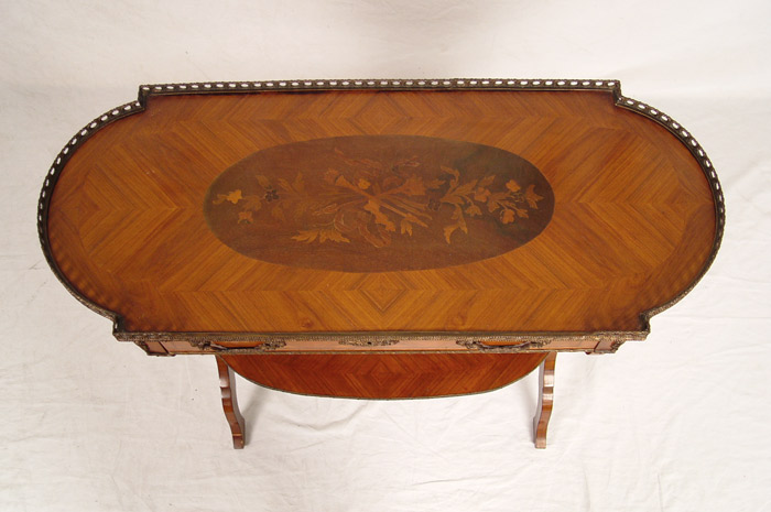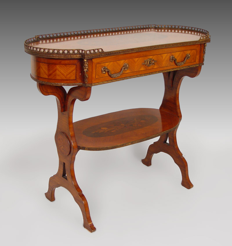 TURN OF THE CENTURY FRENCH STYLE MARQUETRY & PARQUETRY INLAY SIDE TABLE: Long oval table with raised brass gallery , single drawer, apron with detailed brass trim. Two panel legs joined by lower stretcher tier. 32'' tall x 37 1/2'' tall x 15'' deep.
