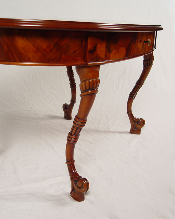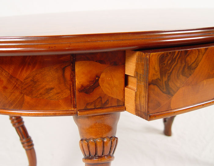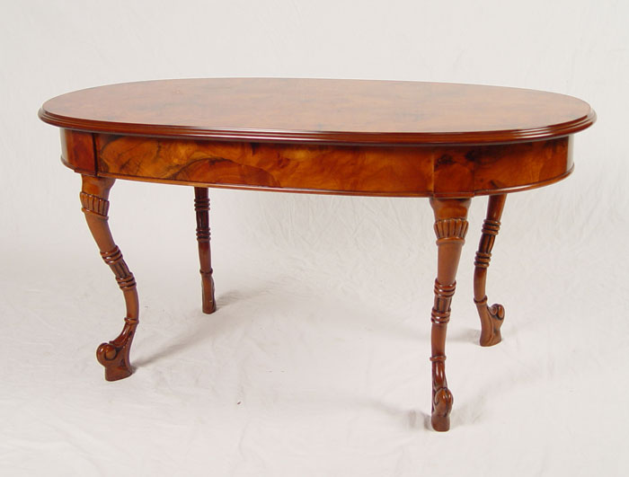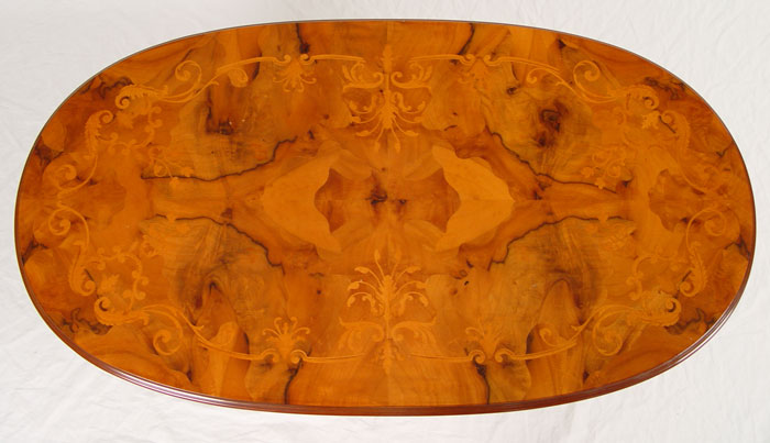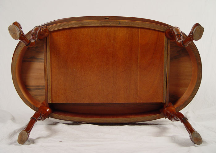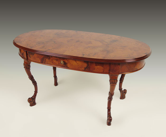 OVAL MARQUETRY COCKTAIL / COFFEE TABLE: Butterfly veneer with Dutch style marquetry inlay. Carved and shaped legs. One drawer with single pull. 39'' wide, 22'' deep, 20'' tall.