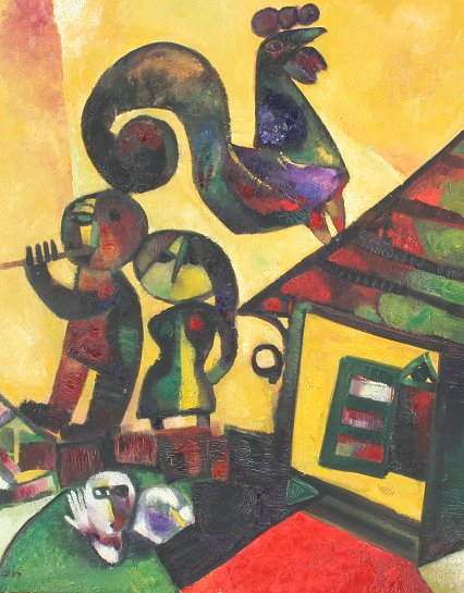 ROTH, Leo, (Israel, 1914-2002): Abstract Man playing Flute with Woman and Rooster, OIL/Canvas, 39 1/2'' x 32'', monogrammed, signed verso, framed, 47 1/2'' x 40''.