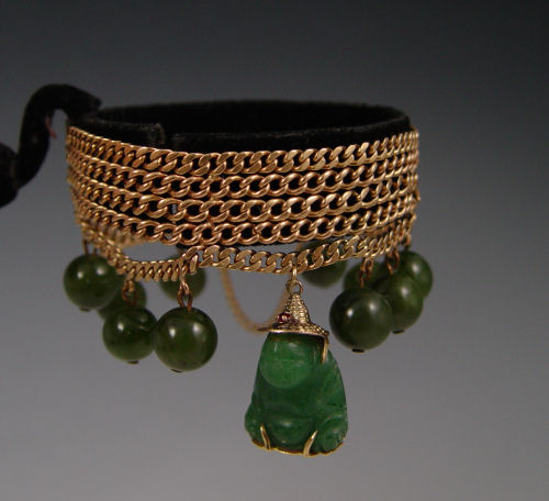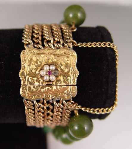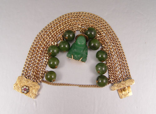 14K GOLD JADE & GOLD BRACELET WITH BUDDHA CHARM: 14K yellow gold 5 strand bracelet with 10 nephrite jade beads, 10.5 mm each. The Buddha is aventurine quartz. Embossed clasp with seed pearls (1 missing). Bracelet is 6 1/2'' l. 3/4'' wide.
