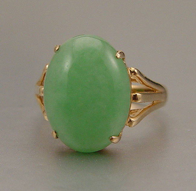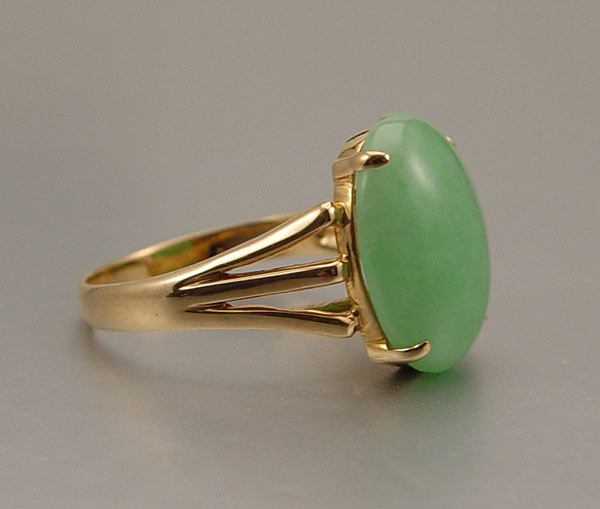 14K JADE RING: 14K yellow gold ring with oval jadeite, 16 x 12 mm. Size 8. Weight 4.8 grams.