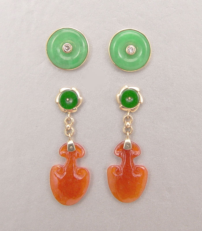 TWO PAIR 14K JADE EARRINGS: 1) Brown jadeite dangles from green jade discs, 1 1/4'' length, post and nut closure. 2) Green lifesaver discs, post and nut closure, 1/2'' dia.
