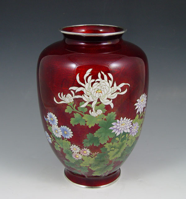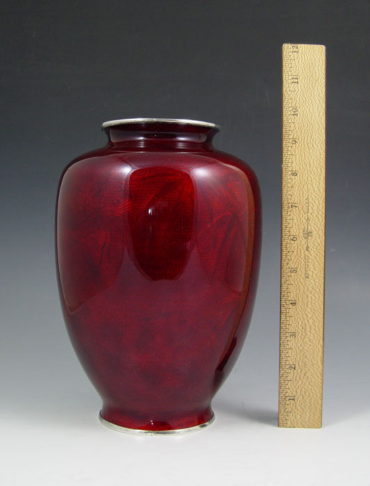 JAPANESE PIGEON BLOOD GINBARI CLOISONNE VASE: Floral design on pigeon blood ground. 9 1/2''h. Marked with an X in a circle.