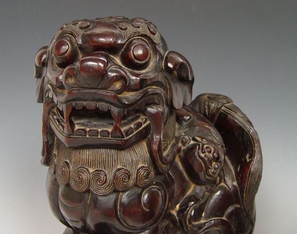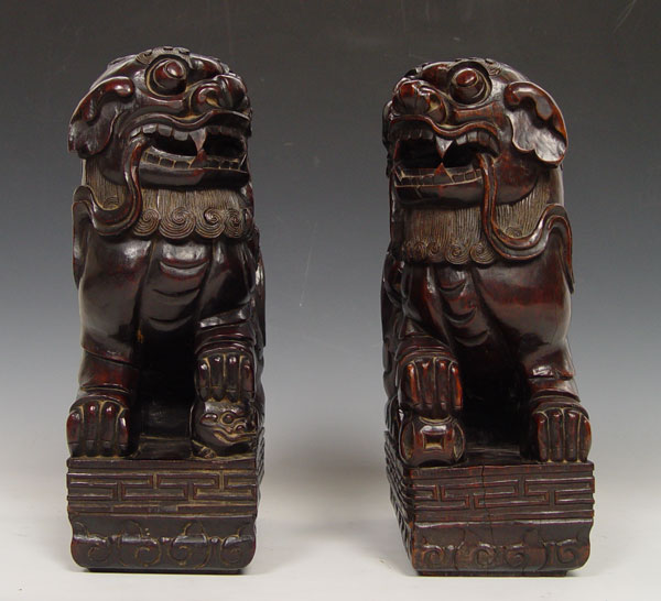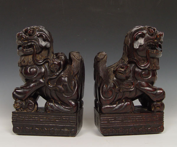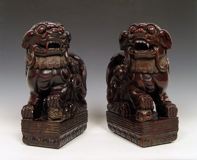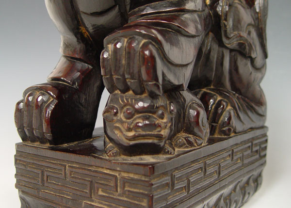 LARGE PAIR CARVED HARD WOOD FOO DOGS: Male with a ball, female with pup. 16'' tall x 9 1/2'' x 6''.