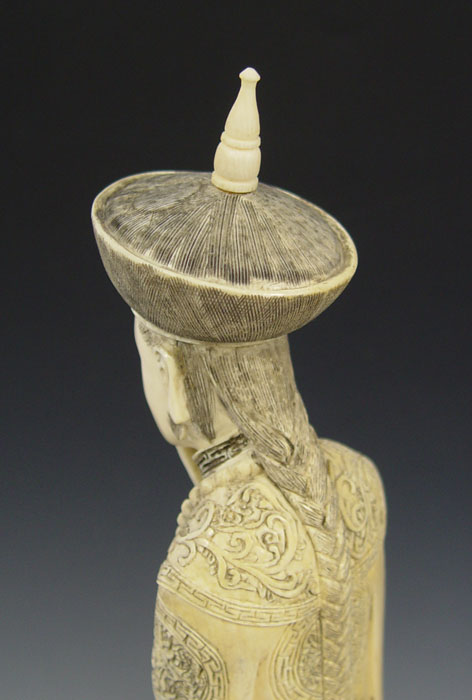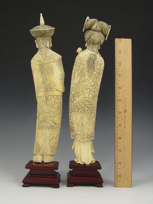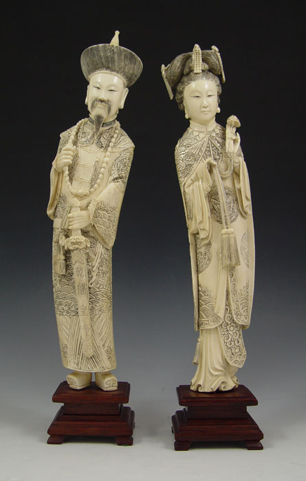 CHINESE CARVED IVORY FIGURES: Elaborate robes and detail, man and woman. Approx. 12'' tall, excluding the wood stands.