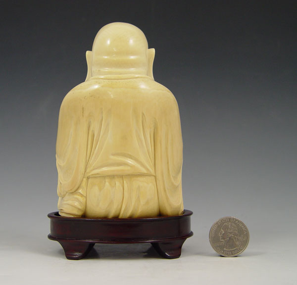 CARVED IVORY HAPPY BUDDHA: Artist signed in characters. Ivory is 5'' h., 3'' wide. Sold with the wood stand.