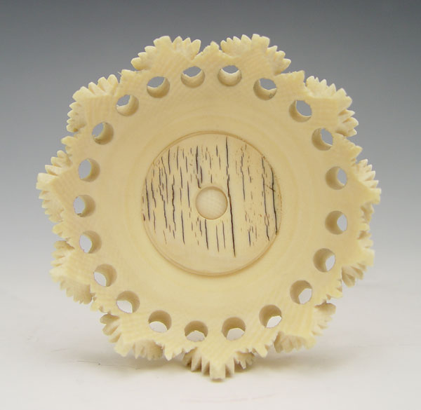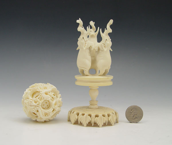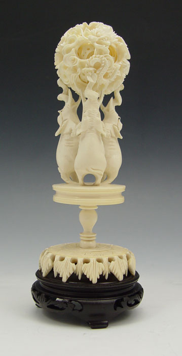 IVORY ELEPHANT STAND WITH MYSTERY BALL: Featuring 3 elephants on hind legs supporting removable carved mystery ball with dragon motif. Measures 7'' h. x 2 3/4'' base dia.