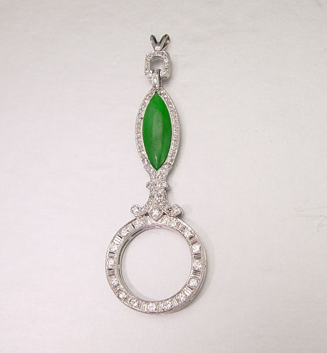PLATINUM 14K DIAMOND & JADE LAVALIER PENDANT: 14K white gold circle of 30 diamonds, approx. 1.05 Ct. The platinum drop contains an additional 137 diamonds, approx. .75 ct. The navette jadeite center stone approx. 20 x 1.5 mm. The front as well as the front are finished off with diamonds. 2 3/4'' length. Weight: 10.4 grams