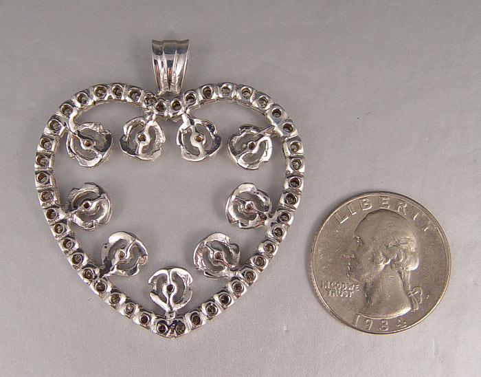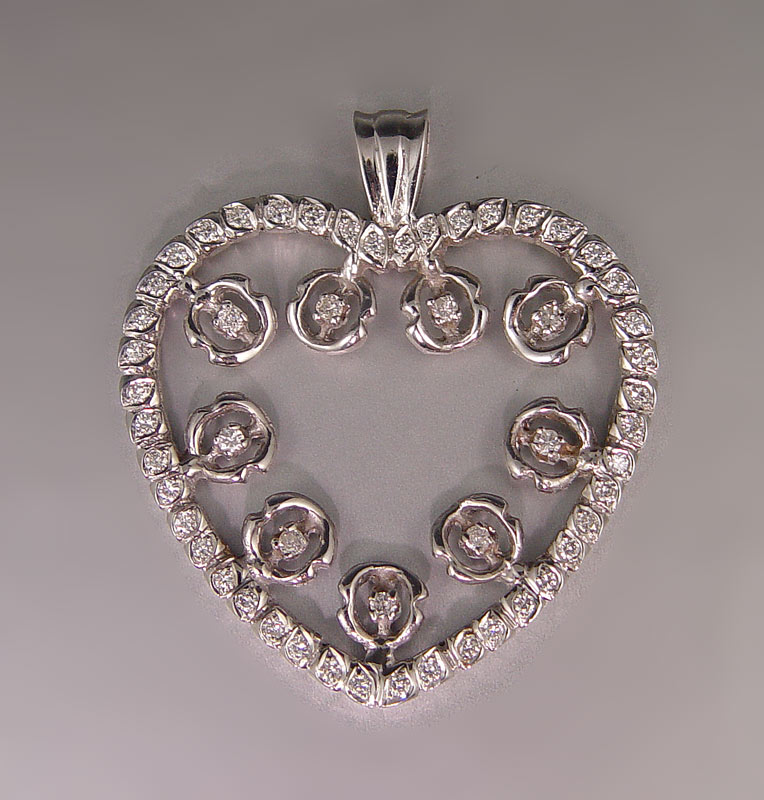 14K DIAMOND ENCRUSTED HEART PENDANT: 14k white gold heart shaped pendant with 53 round full cut diamonds, approx. 1.75 Ctw., averaging H-I color, SI - I clarity. 2''l. overall. Weight: 16.2 grams.