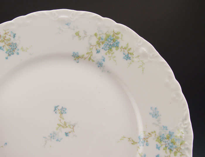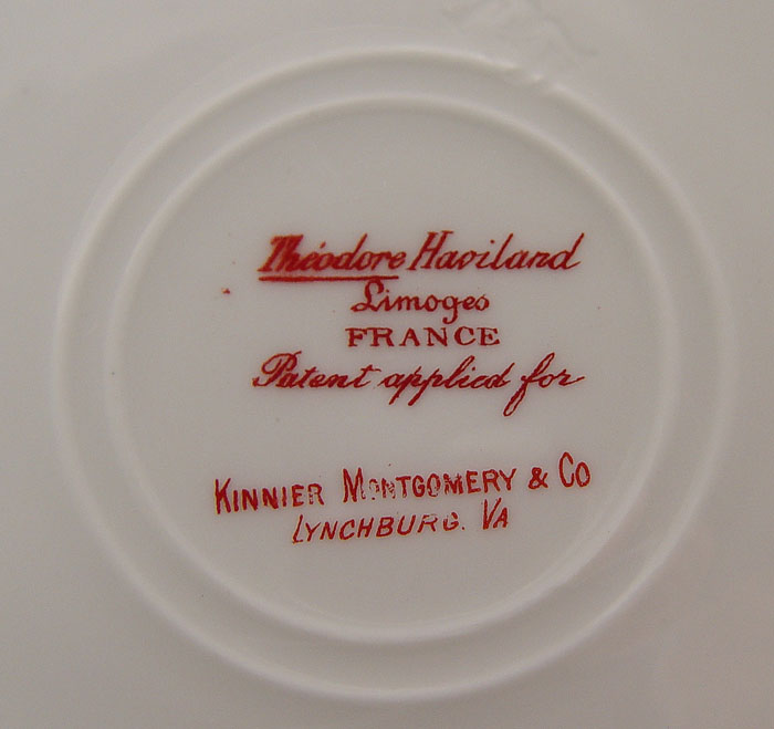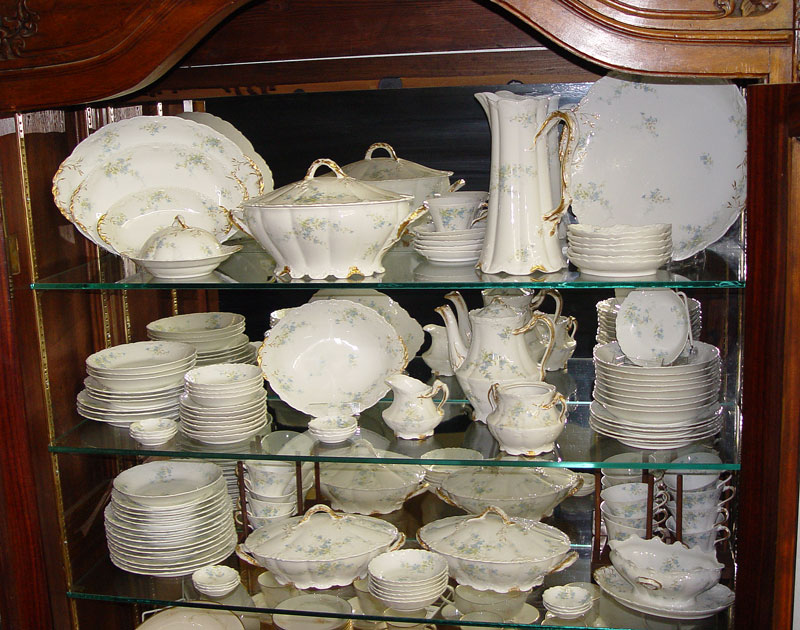 THEODORE HAVILAND FRENCH LIMOGES CHINA SERVICE CA. 1904-1920'S: 85 pieces to include 12 dinner plates, 7 salad plates, 4 soup bowls, 10 dessert bowls, 12 cups, 12 saucers, 6 bone dishes, and 9 butter pats. Serving pieces are the covered tureen, tall tankard, coffee pot, creamer, sugar (no lid), gravy with attached underplate, 2 covered vegetable, an open vegetable, large cake or chop plate, 2 platters and a relish dish.