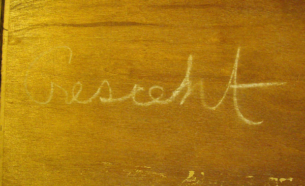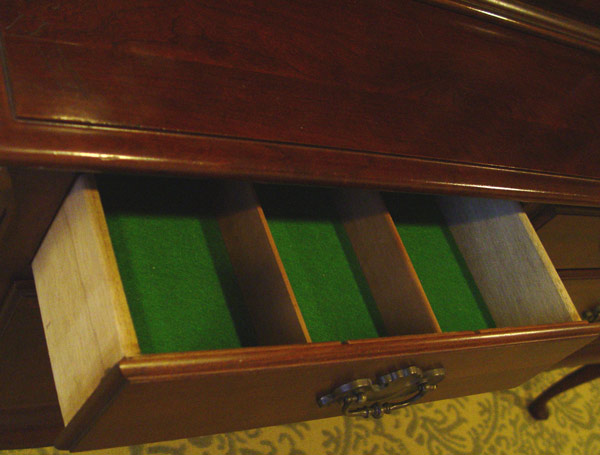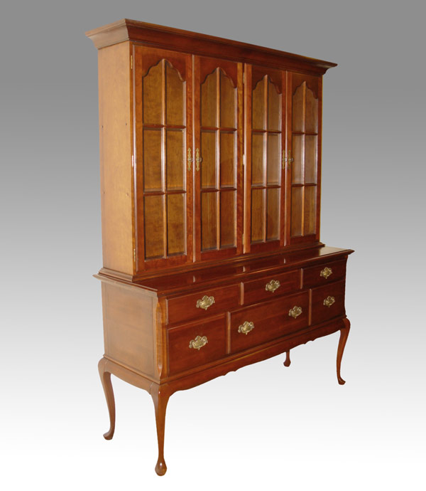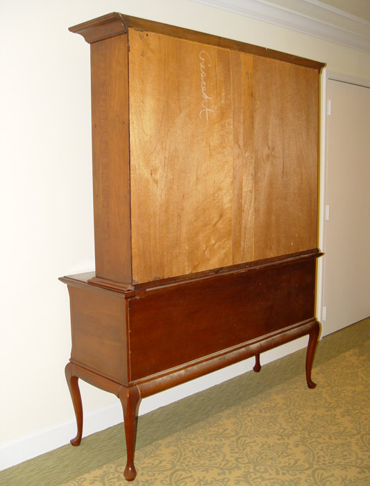 QUEEN ANNE STYLE 2 PART CHINA CABINET: Top section has 4 doors with 2 wood shelves. 6 drawer base on Queen Anne style legs. Modern construction. Hand marked Crescent on back of top section. Measures 81 1/2'' h. x 61'' x 21''.