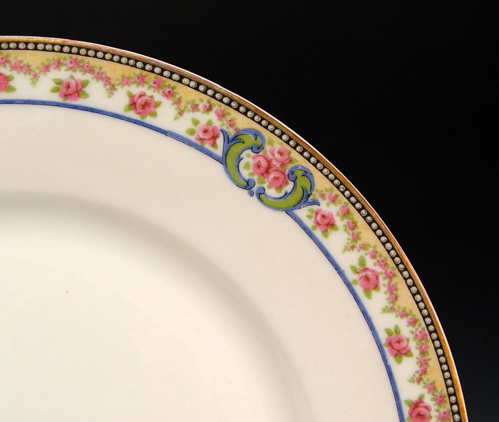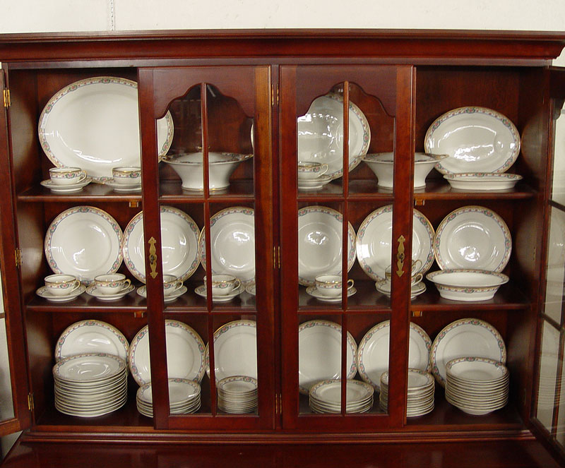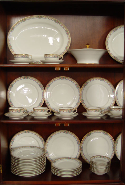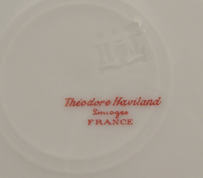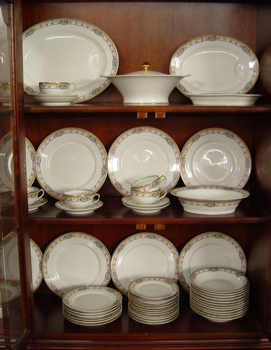 THEODORE HAVILAND FRENCH LIMOGES CHINA SERVICE Ca. 1903-1925: 78 pieces to include 12 dinner plates, 12 salad plates, 12 bread plates, 12 dessert bowls, 11 cups, 12 saucers and the serving pieces. 3 platters (11 1/2'' - 15 1/2''), 2 covered vegetable (1 chip), 1 open vegetable, and a relish dish.