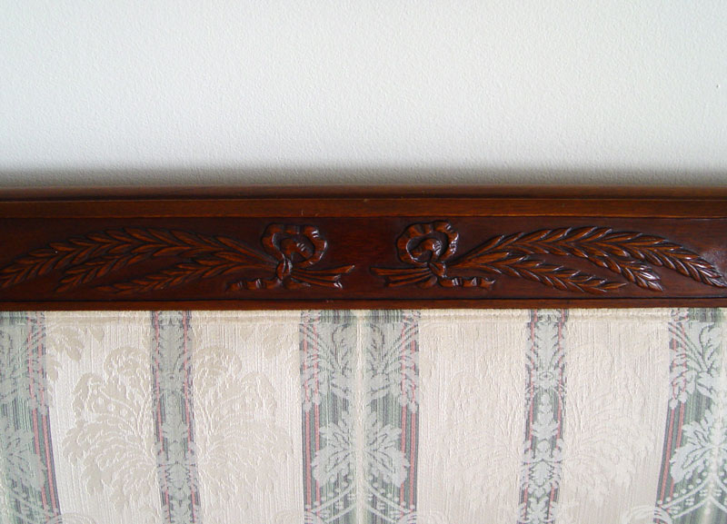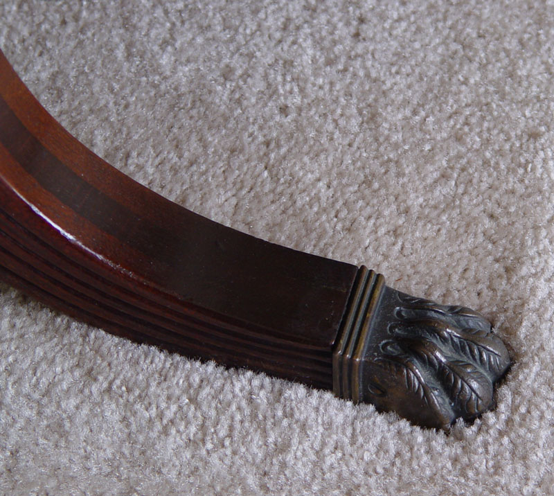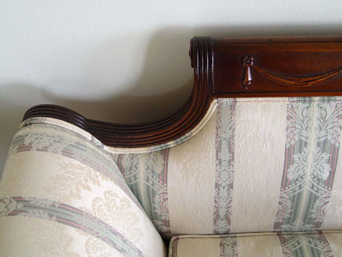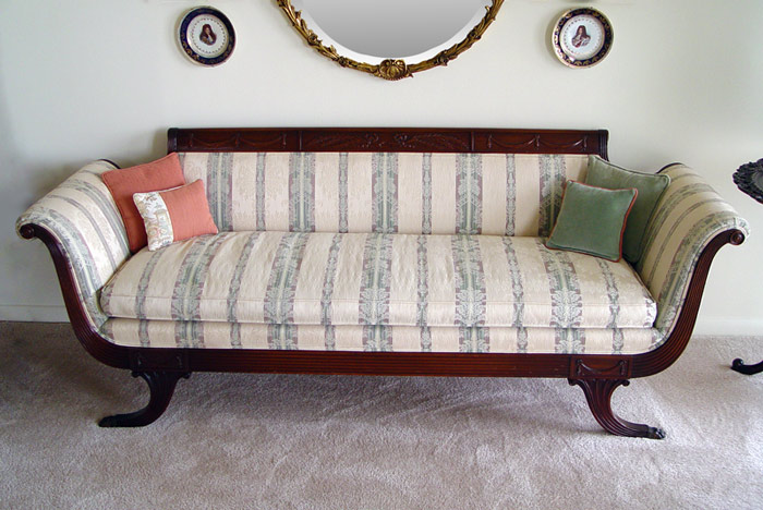SHERATON / EMPIRE SOFA: Transitional Sheraton style sofa with classic front and curved legs with brass capped foot in a Lion paw design. Later cream, teal and pink, striped brocade fabric. 86'' long, 29'' deep, 32'' tall.