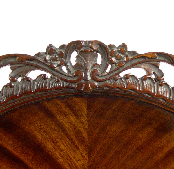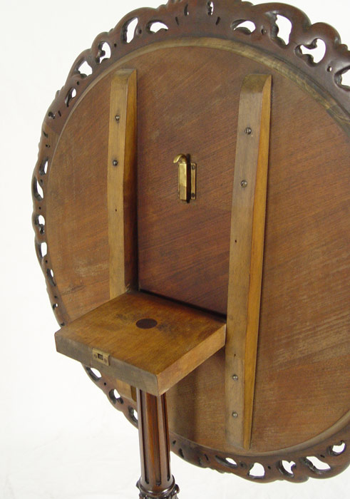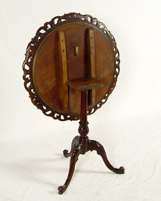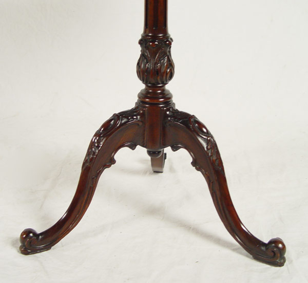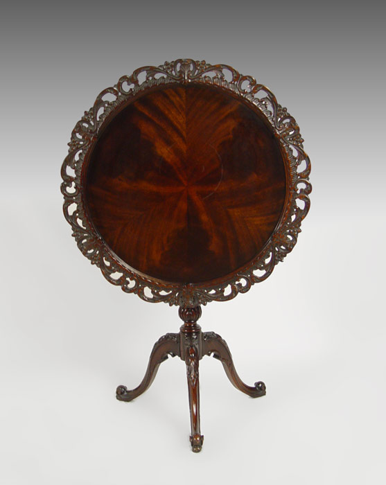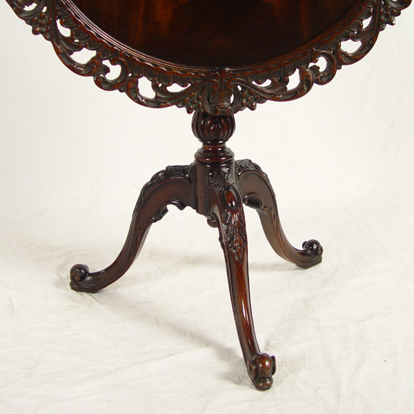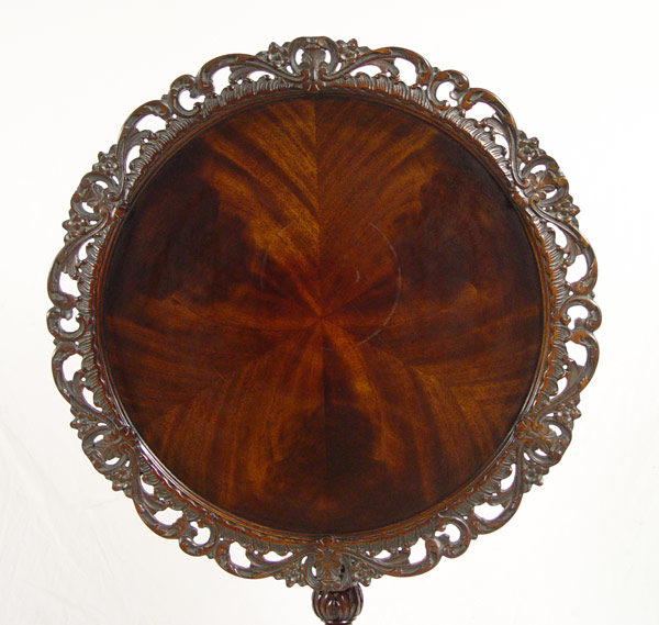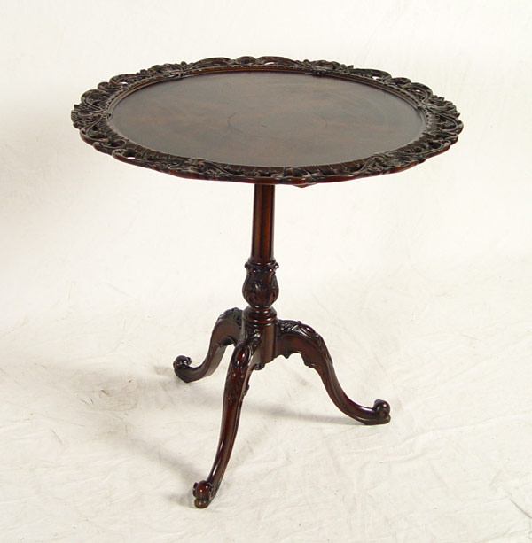 RICHLY CARVED MAHOGANY TILT TOP TABLE: Pierce carved pie crust edge, reeded central column, tripod base. 29'' tall x 29'' dia.