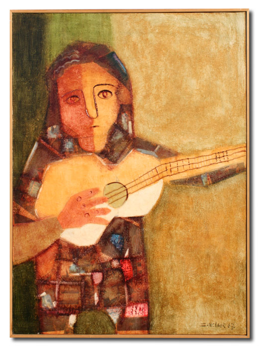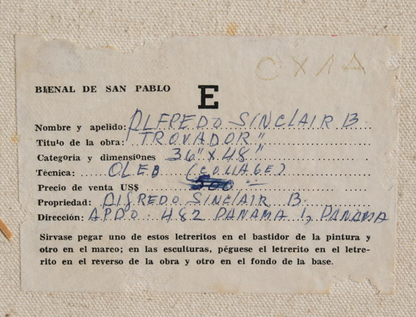 SINCLAIR, Alfredo, (Panama, 1915-): ''Trovador'', Large Mixed Media Portrait, Oil/Canvas with Collage, 48'' x 36'', signed and dated '67, framed, 49'' x 37'', exhibition label verso from Bienal de San Pablo. From the collection of former US Diplomat and State Department official John E. Karkashian.