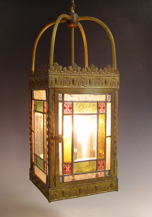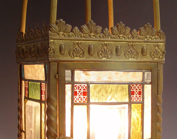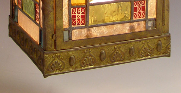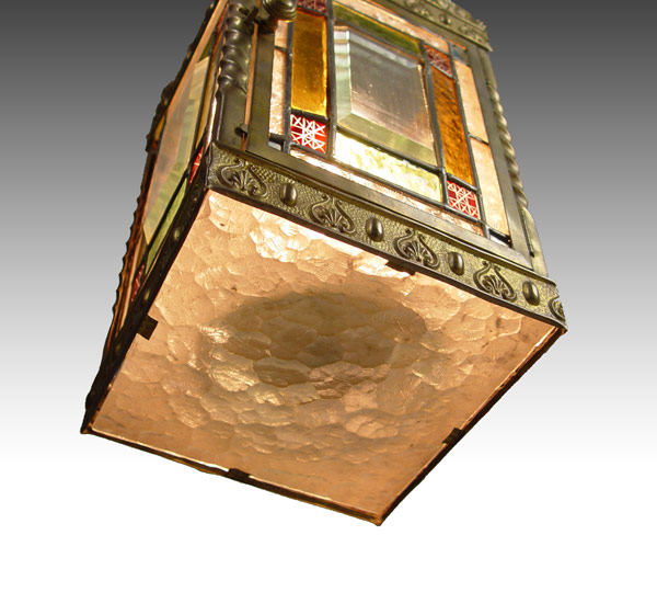 LEADED GLASS HANGING LAMP: Pressed brass with geometric panel glass inserts and glass panel base. 4 socket. Measures 22'' h. excluding chain x 8 1/2'' square.