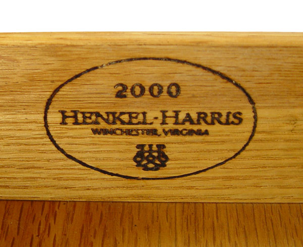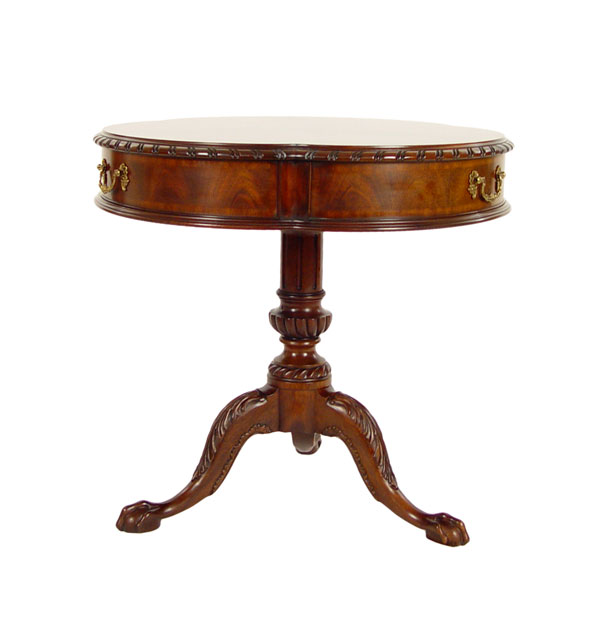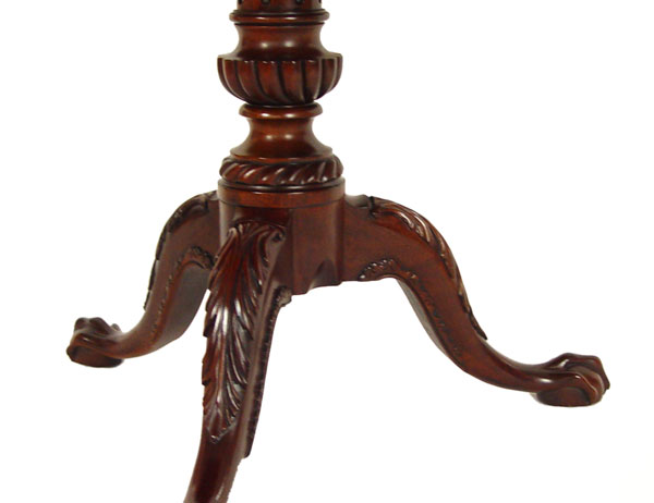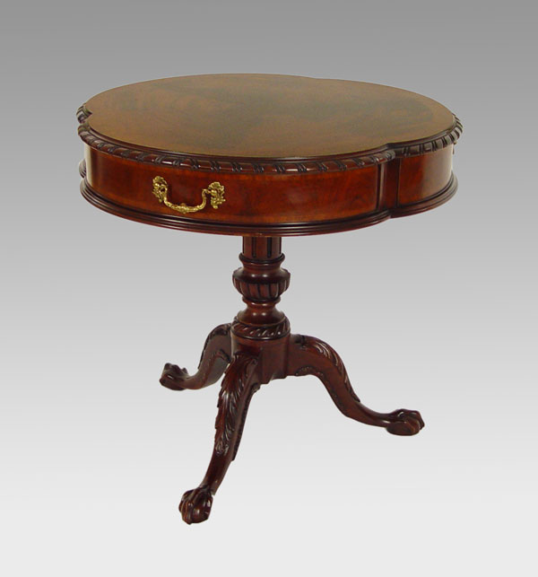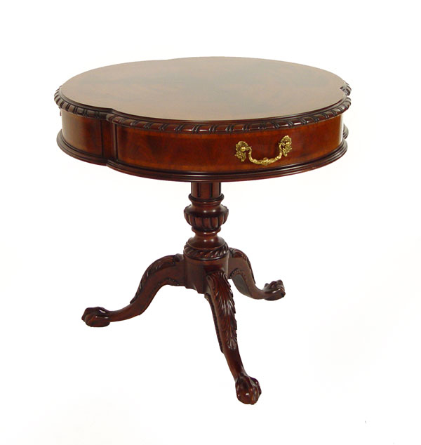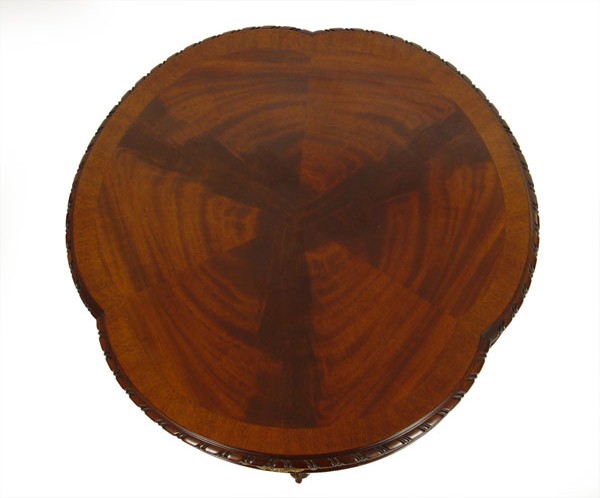 HENKEL-HARRIS MAHOGANY SIDE TABLE: Clover leaf shaped top with flame veneer top. Single drawer with brass pull and two false drawers with brass pulls. Carved pedestal base on three carved legs ending in ball and claw feet. 30'' round, 28 1/2'' tall.