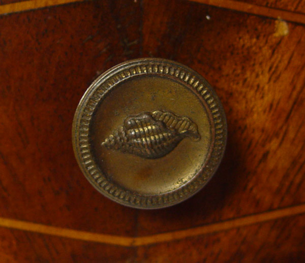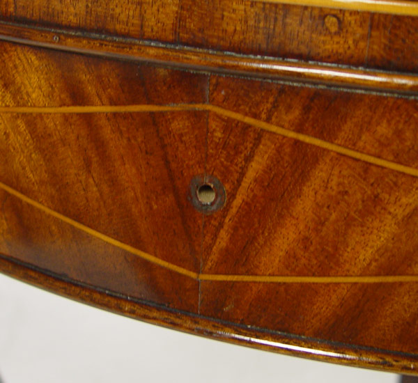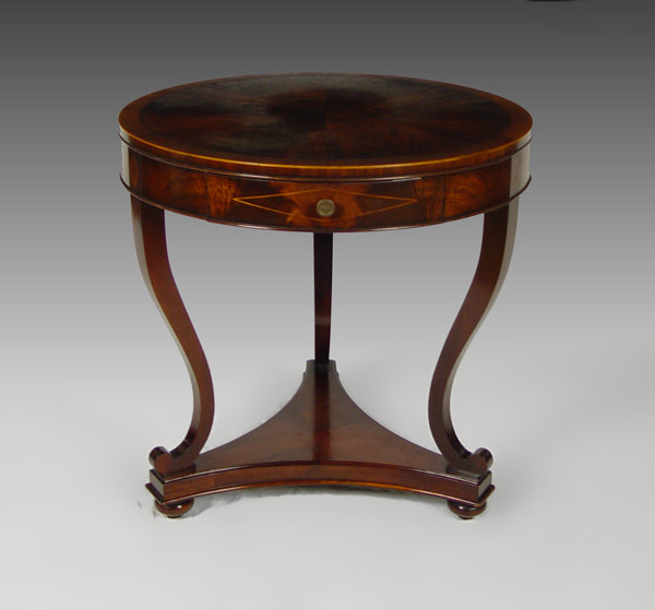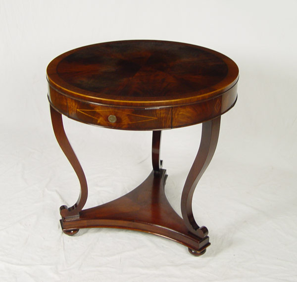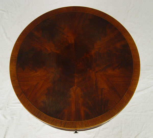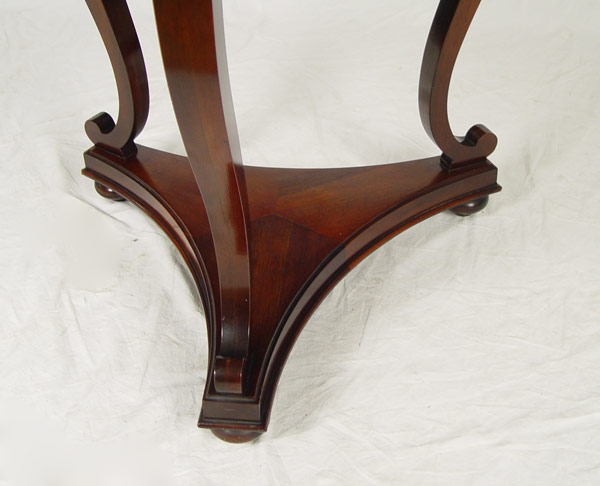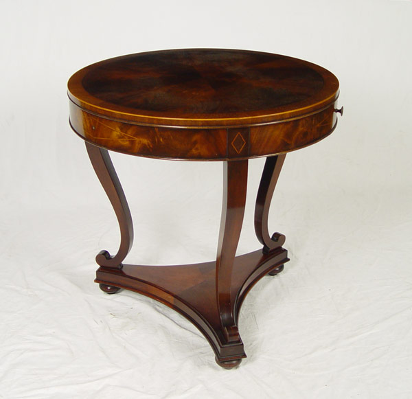 HEIRLOOM WEIMAN FLAME MAHOGANY TRIPLE PEDESTAL SIDE TABLE: Banded border on rich flame mahogany top. Deep apron, one drawer, two false fronts (one missing pull). String inlay. Trio of curved legs on platform base, bun feet. 27 1/2''h. x 27 1/2'' tall.