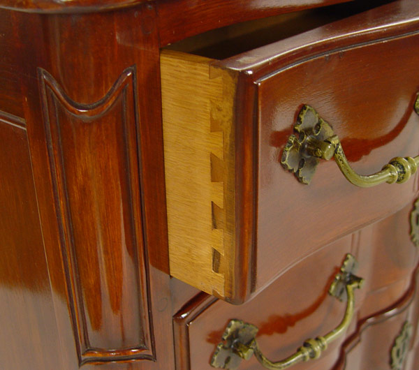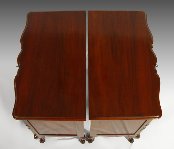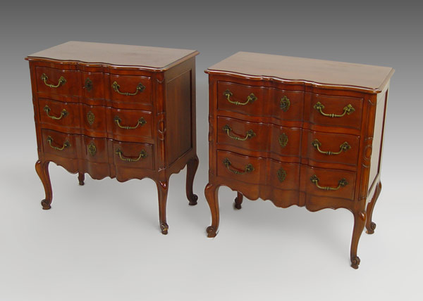 PAIR FRENCH STYLE SERPENTINE FRONT 3 DRAWER CHESTS: Fine quality 3 drawer chests on cabriole legs and French feet. 31'' tall x 29'' x 16''.